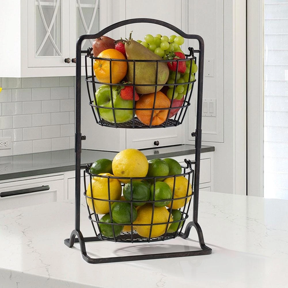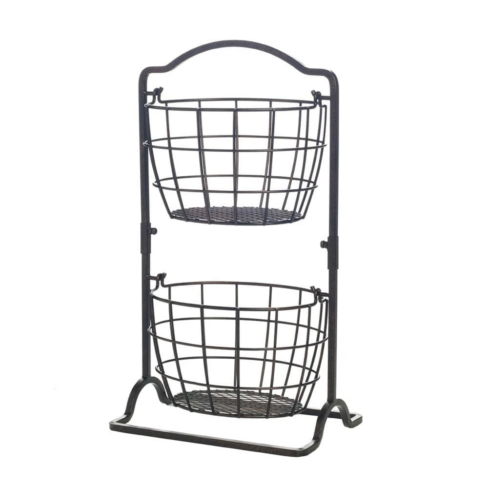 This 2 Tier Harbor Hanging Basket features a beautiful traditional design and allows you to maximize space in any room of your home. This 2 tier basket is great for storing or displaying food or other items. Crafted from wrought iron for long-lasting beauty even under rigorous use. Wipe clean with damp cloth. Measures 17-1/2 inches high x 6-3/4 inches wide x 10 inches long. This product contains Carbon Black. For more information about chemicals in this product, visit www.lifetimebrands.com/ab1200