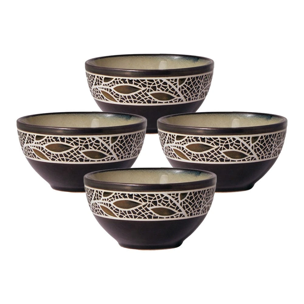 This Gourmet Basics by Mikasa Alexandria Set of 4 Fruit Bowls feature warm, tranquil earth tones of bold espresso and soothing beige, and a striking rim design adorned with sprigs of golden brown leaves and highlighted by a crackle effect, with a reactive glaze finish. Due to the nature and hand-crafted qualities of reactive glaze, no two pieces are exactly alike and will exhibit unique variations in color and pattern. Product may slightly differ from image shown.