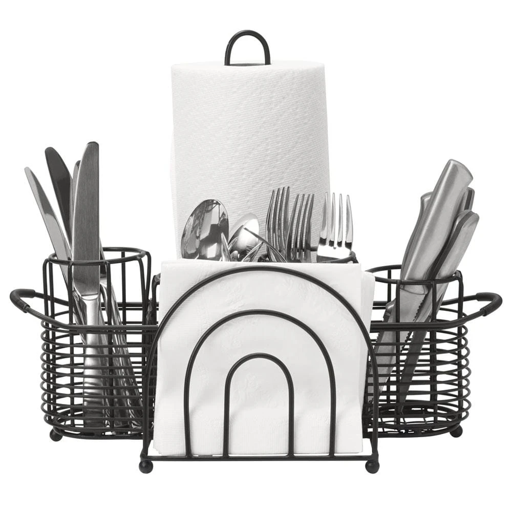 This Gourmet Basics Art Deco Hostess Buffet Storage Caddy features a contemporary black finish that complements most decors. The wire frame design provides clear visibility of the contents, and the caddy features 4 compartments to keep utensils divided and organized, a slot for napkins, and a paper towel holder. Caddy has a convenient handle on top for carrying.