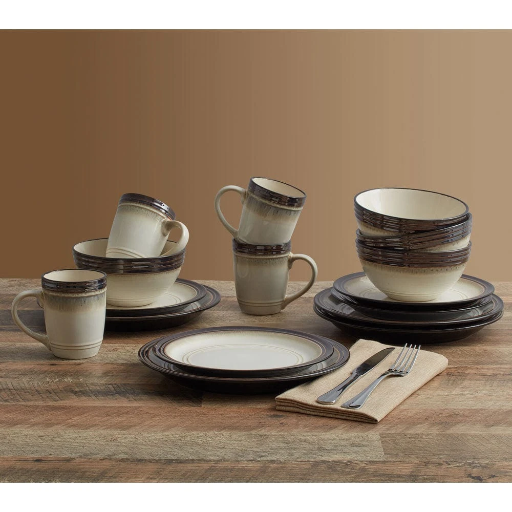 Crafted of Stoneware, featuring a reactive glaze. Due to the nature and hand-crafted qualities of reactive glaze, no two pieces are exactly alike and will exhibit unique variations in color and pattern. Product may slightly differ from image shown. 16 piece dinnerware set, service for four, includes (4) each: 10-1/2 inch dinner plate, 8-3/4 inch salad plate, 6-1/4 inch diameter x 3 inch high (32 ounce) soup bowl and 4-1/4 inch high (14 ounce) mug. Microwave and dishwasher safe.