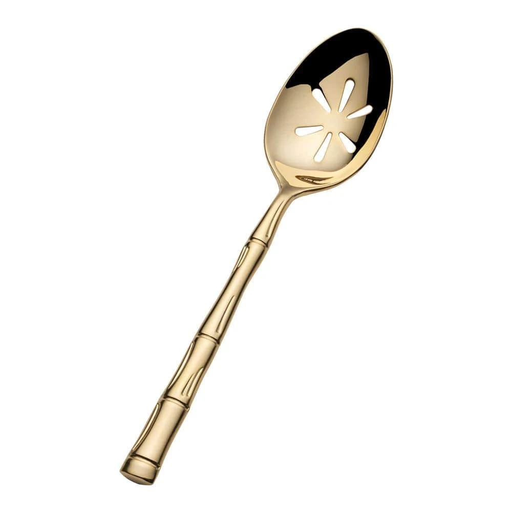 Add a radiant gleam to your table with this Wallace Bamboo Gold Flatware. Quality crafted of 18/10 stainless steel with gold plating and featuring a bamboo design. Hand wash. This Pierced Serving Spoon is suitable for scooping vegetables and fruits, while leaving the juices in the bowl. Pierced Serving Spoon measures 11-5/8 inch long.