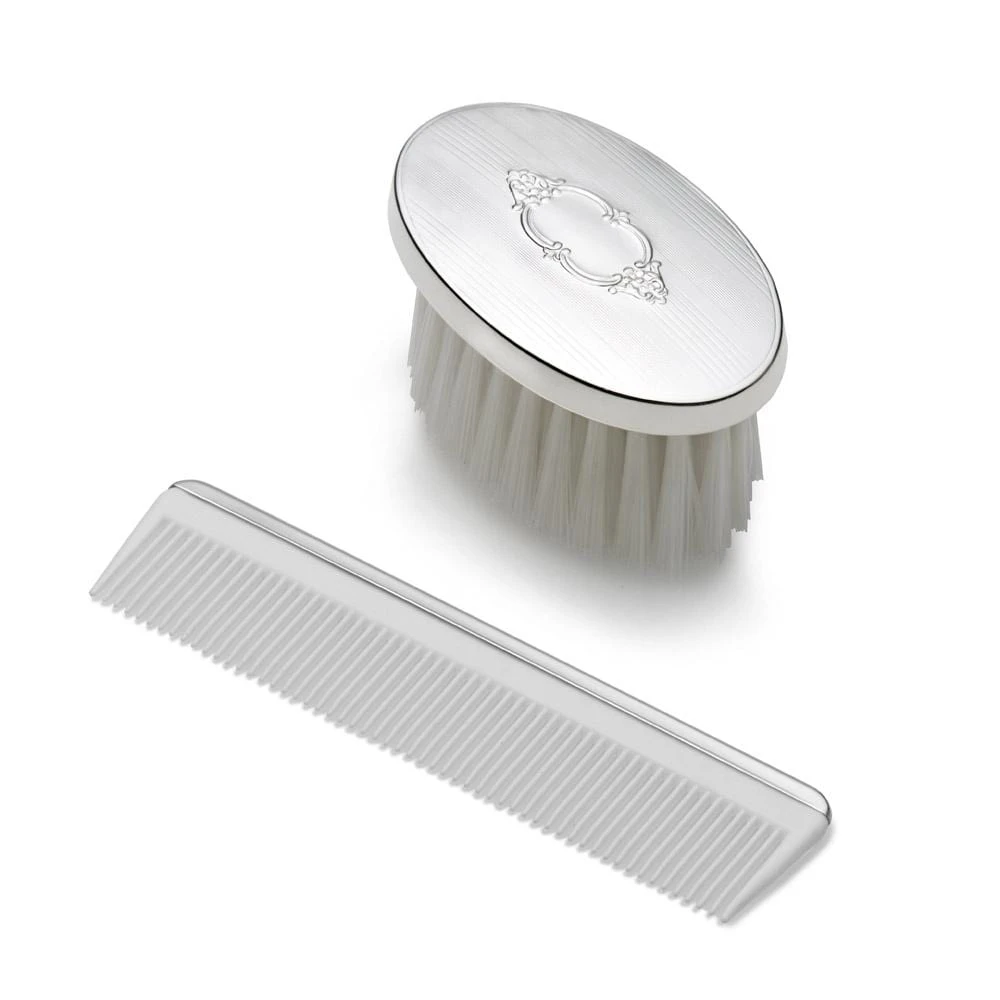 This sterling silver Boys Oval Shield Brush Comb Set, by Empire Silver, is the perfect gift to welcome a new life into the world. New parents will notice your good taste with this cherished heirloom that will be passed down for generations. Brush bristles are made of nylon. Made in America. Comes beautifully gift boxed. Measures 2-3/4 inch long x 1-5/8 inch wide.