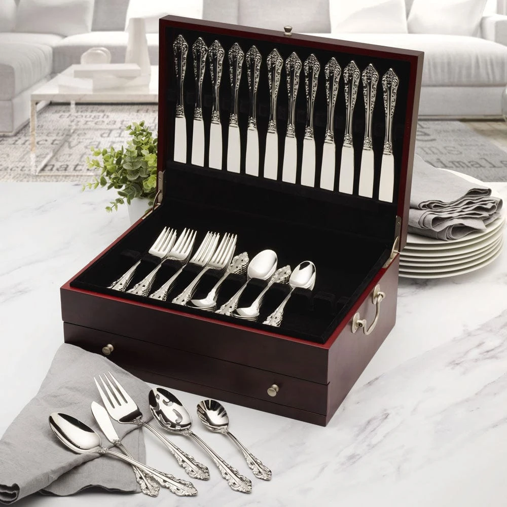 From our family of brands, this Wallace Dark Walnut Single Drawer Flatware Chest features slots to keep utensils separate and organized, and a bottom drawer for additional storage. Can hold a service for 12 in the individual slots, and the elegant black velvet lined interior will gently cradle the contents.