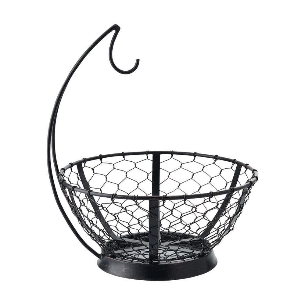 This Farmers Market Basket with Banana Hanger is perfect for displaying fruit while allowing it to breathe, plus, you can hang bananas on the hook above the bowl to allow for ripening. Hand crafted from iron for long-lasting beauty even under rigorous use, the basket features a wire frame design with an antique black finish that complements any deccor. Wipe clean with damp cloth. Fuit basket measures 12 inch diameter x 14-3/4 inch high.