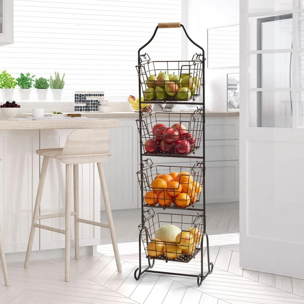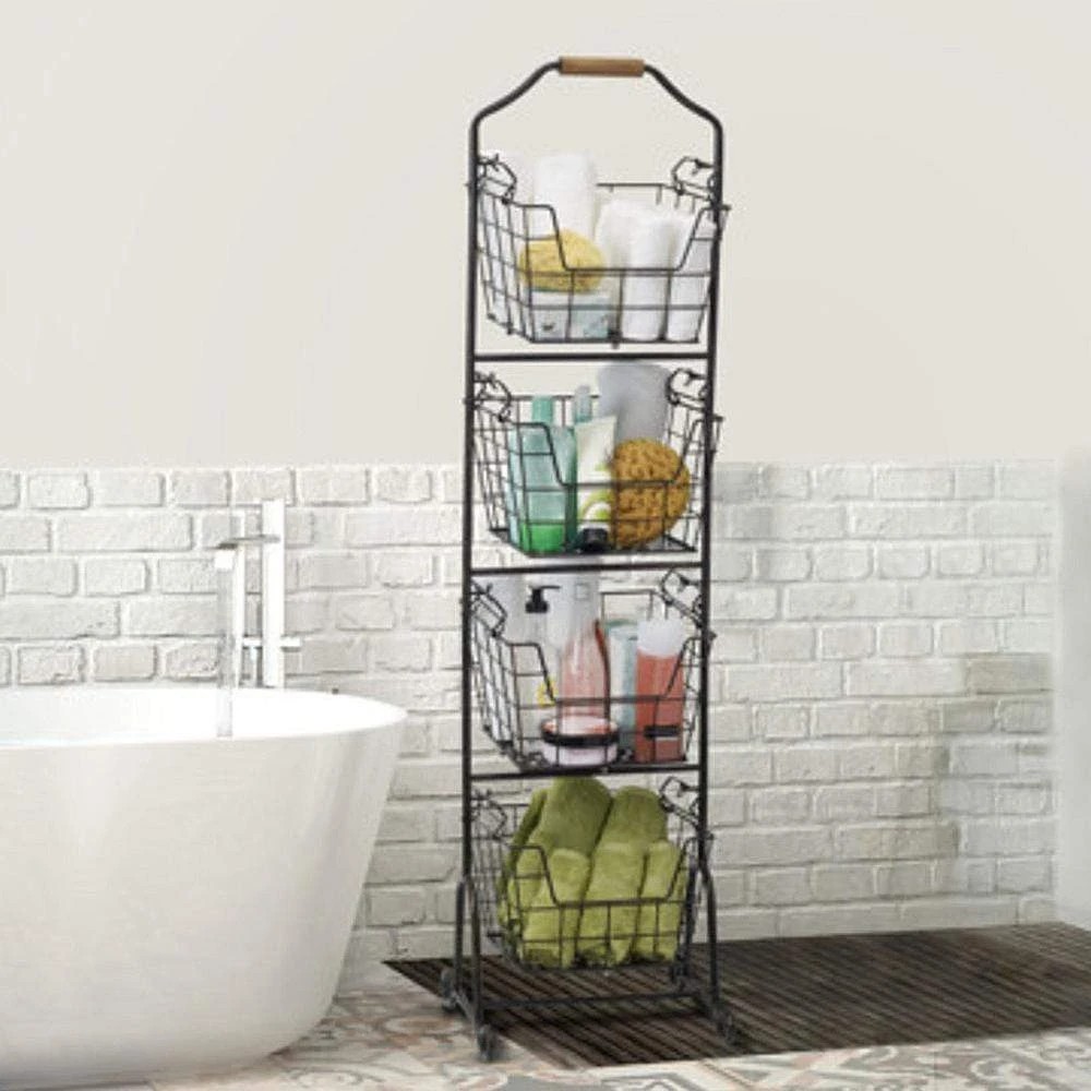 This Ferme 4 Tier Standing storage rack is a practical and stylish storage solution that will bring organization to any room of the house. Standing Rack is adjustable to hold 2, 3 or 4 baskets. Each of the 4 baskets is ideal for holding everything from fruits and vegetables to toys and linens. Accented in antique black finish with an acacia wood handle, rack is crafted from wrought iron for long-lasting beauty even under rigorous use. Wipe Clean with a damp cloth. Adjustable Standing 4 Tier Rack measures 51 x 13-1/2 x 12 inches. Baskets measures 11 inch square, 7 inches high. 3 Tier measures 40-1/2 inches high. 2 Tier measures 29-1/2 inches high. This product contains Carbon Black. For more information about chemicals in this product, visit www.lifetimebrands.com/ab1200