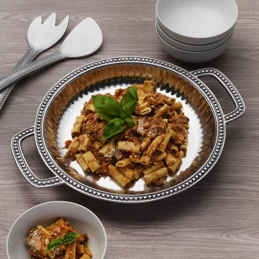 This Wilton Armetale® Flutes & Pearls Low Handled Tray features a traditional fluted design surrounded by a delicate beaded outer edge. Wilton Armetale® Serveware is ideal for your cooking needs, food stays hot longer and perfect for oven, stove or grill. Designed and crafted by hand, these beautiful products were made to last a lifetime.