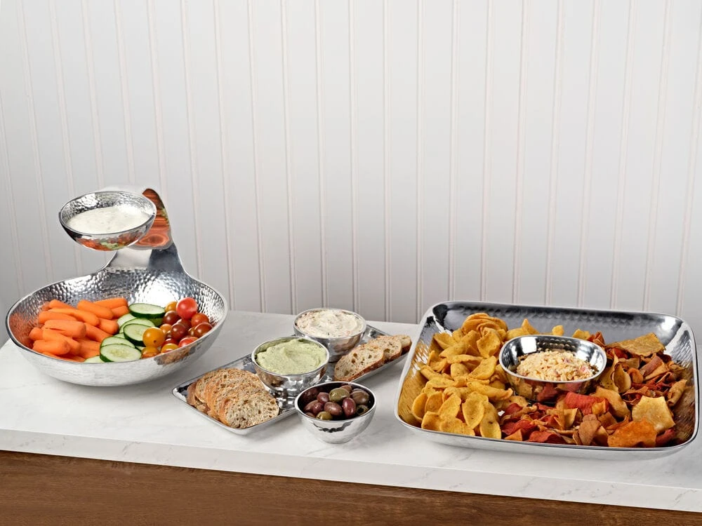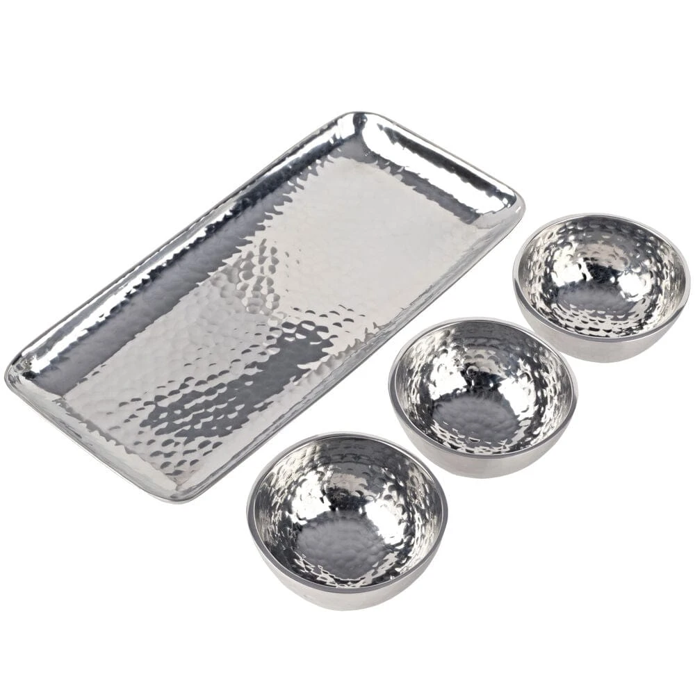 This Towle Hammersmith Set of 3 Small Bowls on Tray is an elegant addition to your serveware and is perfect for bringing condiments, dips. and more to your guests. Featuring a rustic hammered finish, this durable set is crafted of food-safe alternative metal alloy, which will not scratch or dent under normal use. Tray measures 11-3/4 x 5-1/2 inches. Each bowl measures 3-3/4 inches in diameter. Hand-wash with warm water and a mild detergent; rinse and dry immediately.
