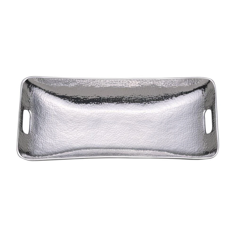 Perfect for serving your guests, passing hors doeurves or displaying fresh fruit, this beautiful tray is durable and has a rustic hammered finish. Crafted of food-safe alternative metal alloy. This tray will not scratch or dent under normal use. Oven safe for warming food and freezer safe but not dishwasher safe. Hand washing is recommended. Tray measures 18-1/2 inch long x 9 inch wide.
