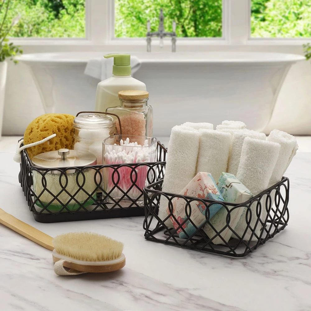 • Top small basket measures 7-1/4 inch square x 3-1/4 inch high; Bottom large basket measures 10 inch square x 3-3/4 inch high