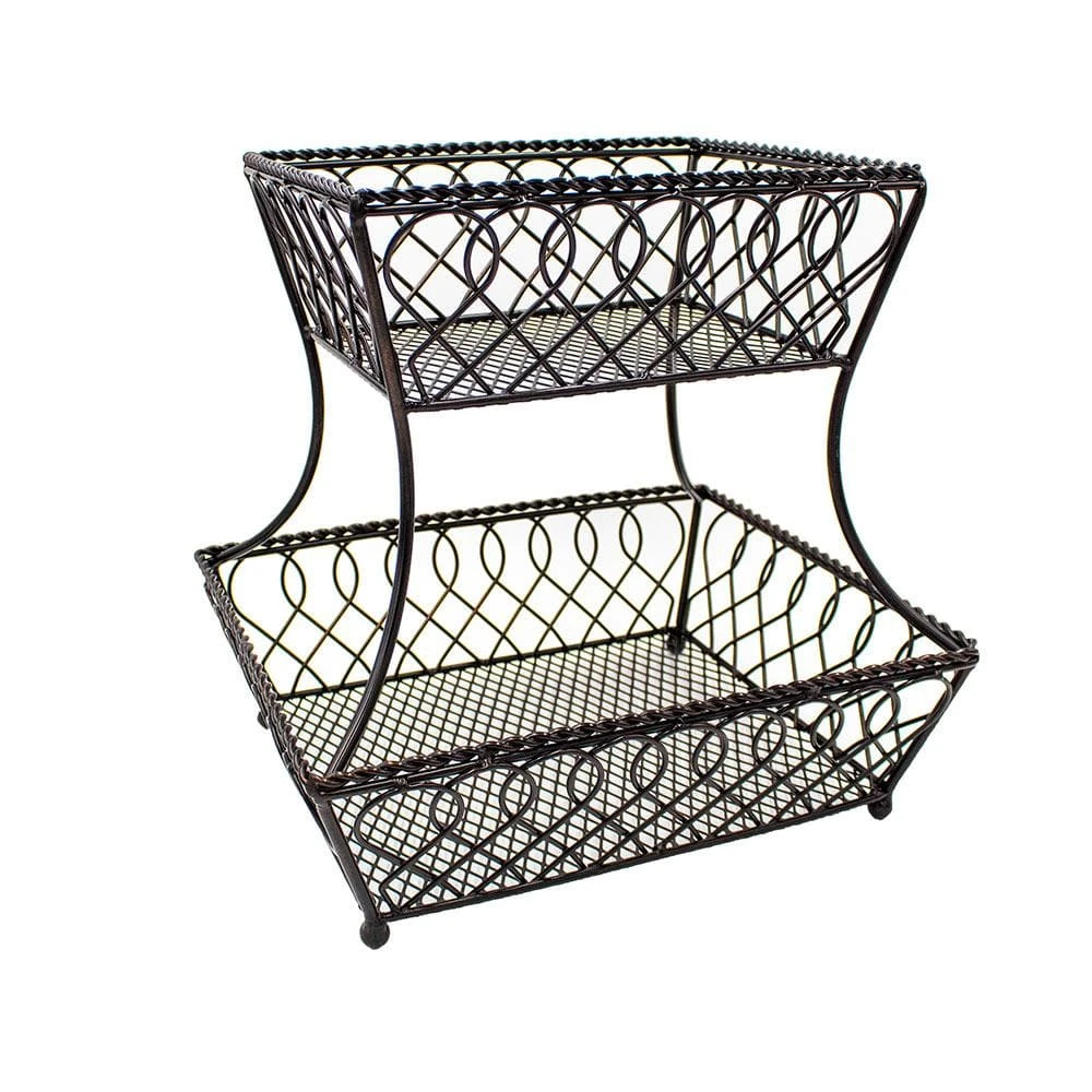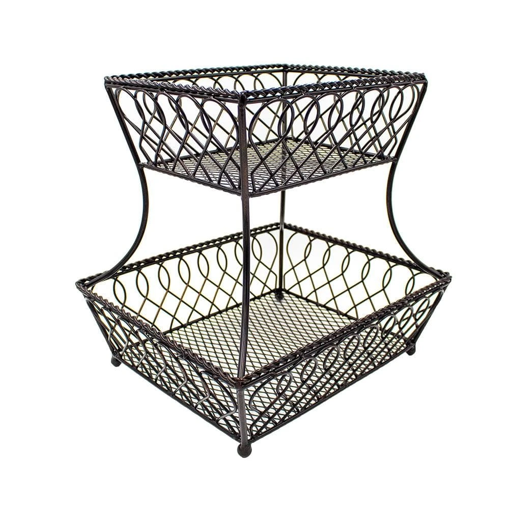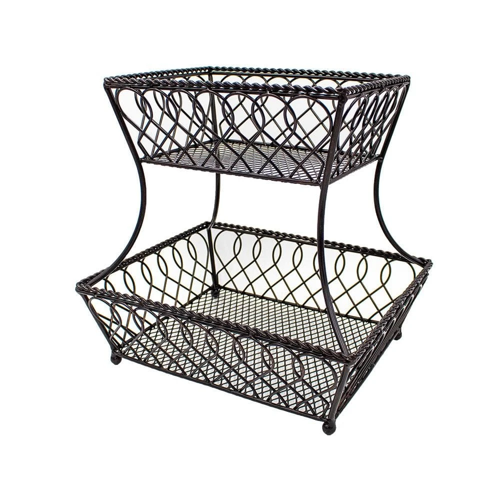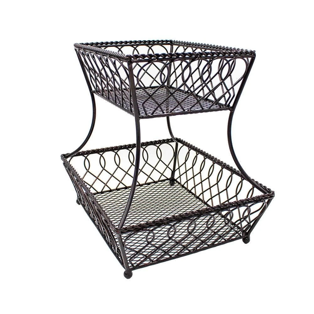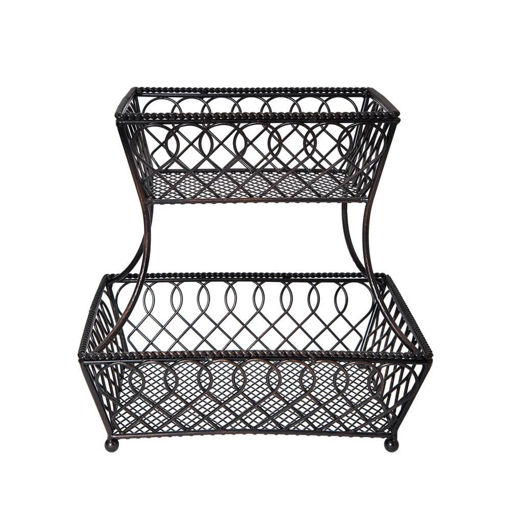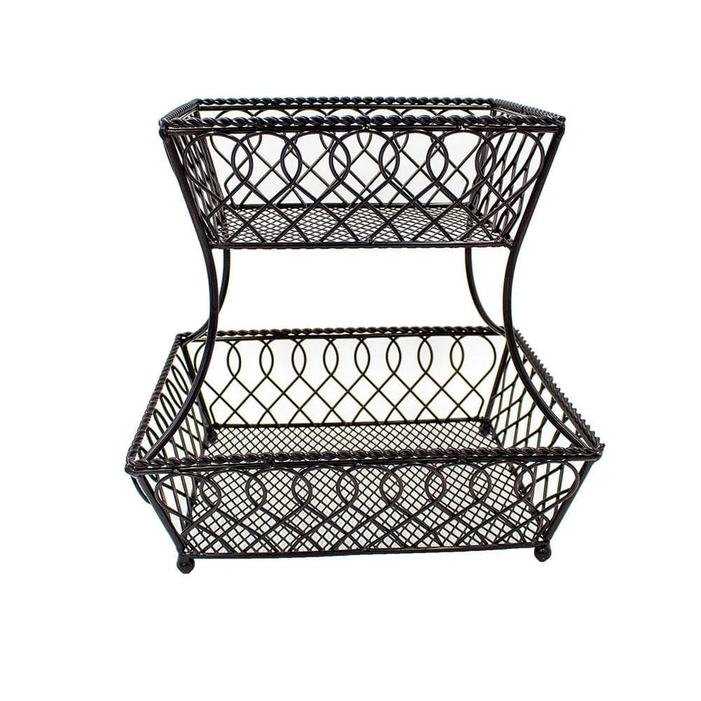 This Loop Lattice 2 Tier Rectangular Basket is a perfect catch-all, as well as a decorative accent for your kitchen counter. Handcrafted from wrought iron for long-lasting beauty even under rigorous use. The basket features an attractive loop design that will complement any decor. To clean, simply wipe with a damp cloth. Measures 14 inches high x 12 inches wide. This product contains Carbon Black. For more information about chemicals in this product, visit www.lifetimebrands.com/ab1200