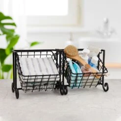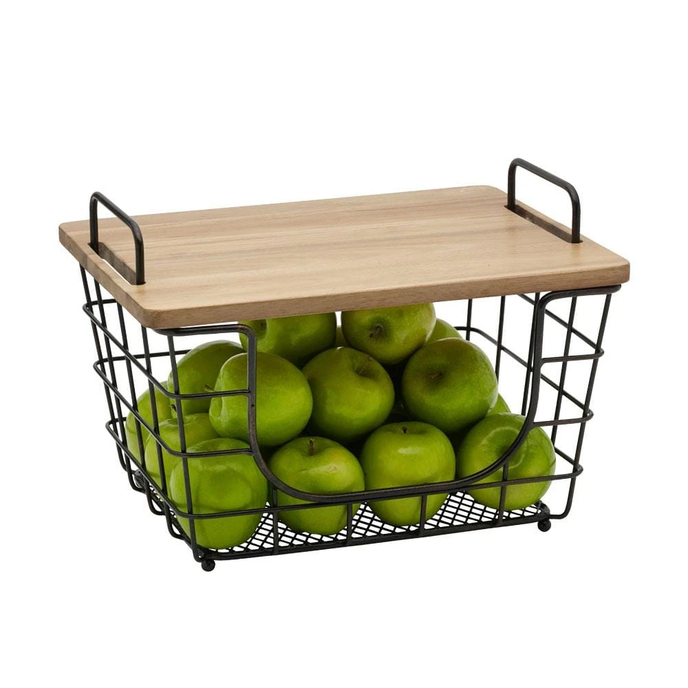 This Madam Stacking And Nesting Basket with Acacia Lid is crafted of a steel antique black finish for long lasting beauty even under rigorous use. The stacking and nesting capabilities of the basket allows for multiple uses and easy storage. Its great for storing or displaying food or other items and features a timeless design that will complement any decor.
