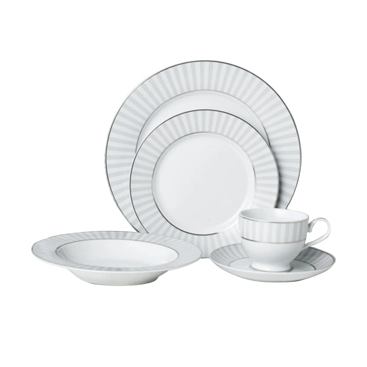 • 5 piece place setting includes a 10-1/2 inch dinner plate, 8-inch salad plate, 10 oz rim soup bowl, 6 -inch saucer and 8-1/4 ounce teacup