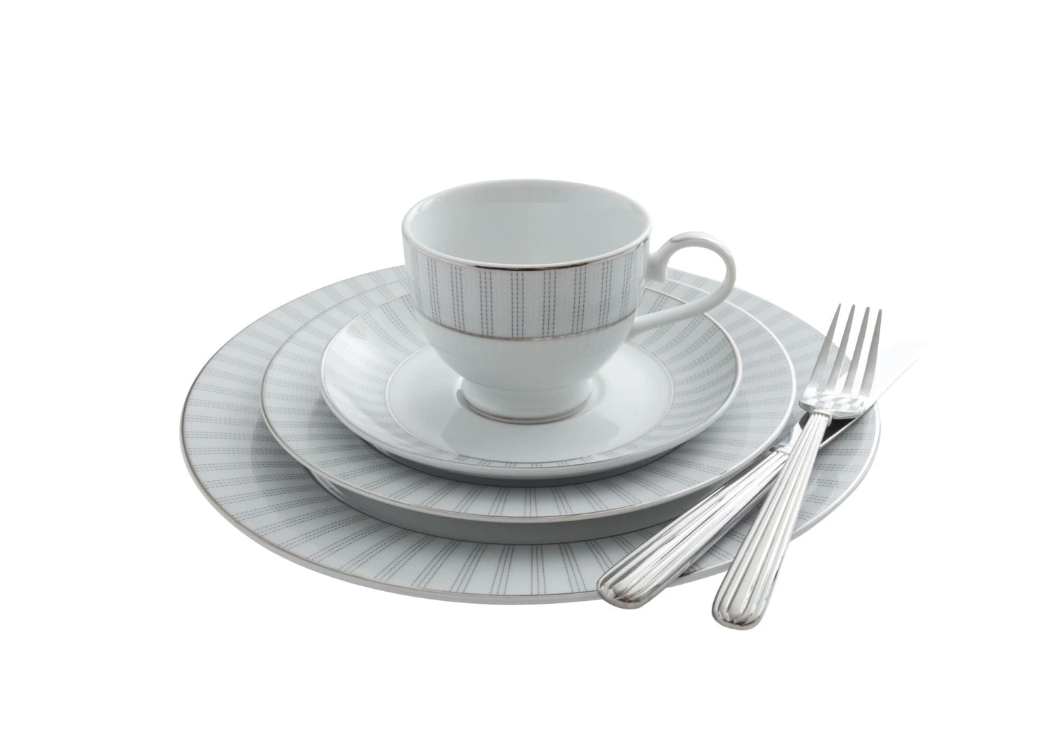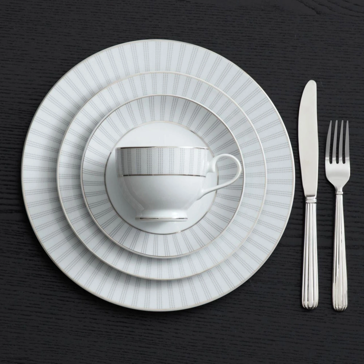 Adrian Grey dinnerware brings sophistication to the table with its contemporary, micro geometric design, and elegant platinum banding.