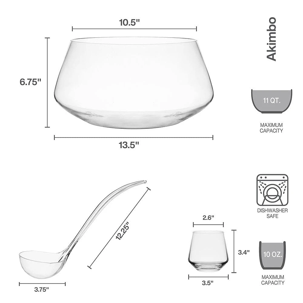• Punch Bowl measures 13-1/2 inch diameter x 6-3/4 inch high, and Holds 11 quarts