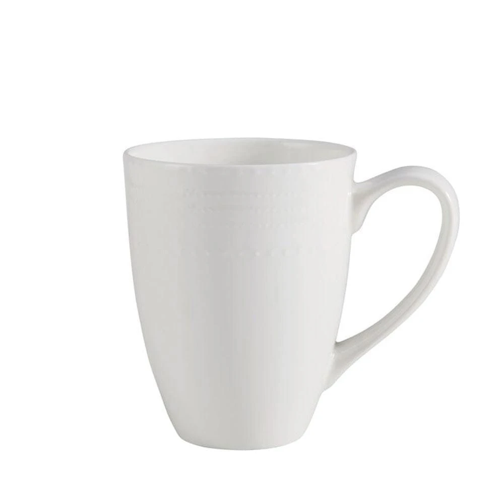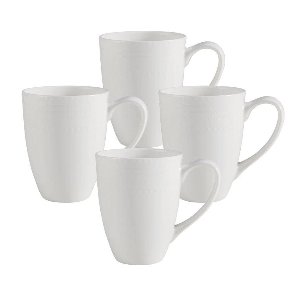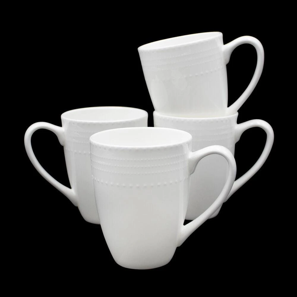 Bring stylish sophistication to any gathering with Annabel Dinnerware by Mikasa. White bone china in timeless shapes features delicate, hobnob detailing around each piece, giving your place settings a touch of classic design. Microwave and dishwasher safe. Set of 4 mugs, each measures 3-1/2 inch diameter, 5 inch wide with handle x 4-1/2 inch high and holds 14 ounces.