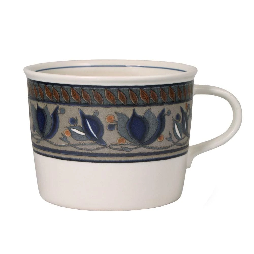 This elegant casual stoneware dinnerware has been a favorite since its introduction in 1986. The bold stylized navy blue tulips and vines on a rustic background flow around each of the pieces. Add the creamer and sugar, oval covered casserole, or any of the accessory pieces to expand your elegantly casual table. And once the dinner is over, all the pieces can go in the dishwasher for easy clean up. The pattern is also oven safe, microwave save and freezer safe. Jumbo soup mug measures 4-3/4 inch diameter x 3-1/2 inch high and holds 24 ounces.