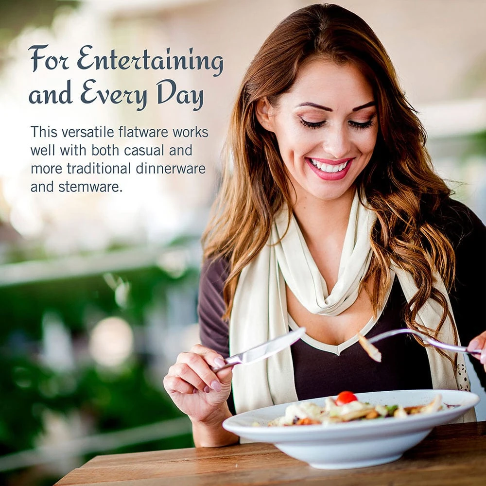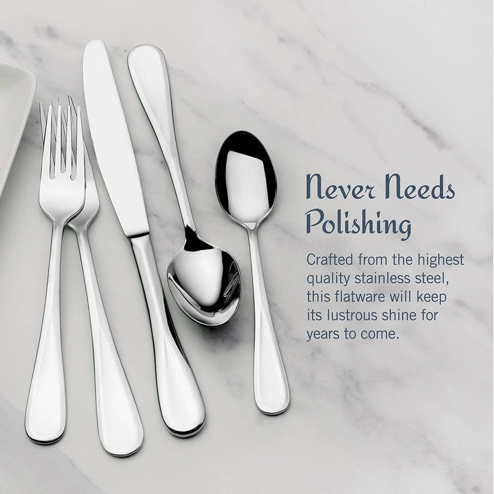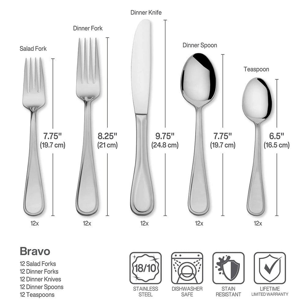 Mikasa Bravo 18/10 stainless steel, 65 Piece Flatware Set includes (12) each: dinner fork, salad fork, dinner knife, dinner spoon & teaspoon, PLUS (1) each: tablespoon, pierced tablespoon, cold meat fork, sugar spoon & butter serving knife.