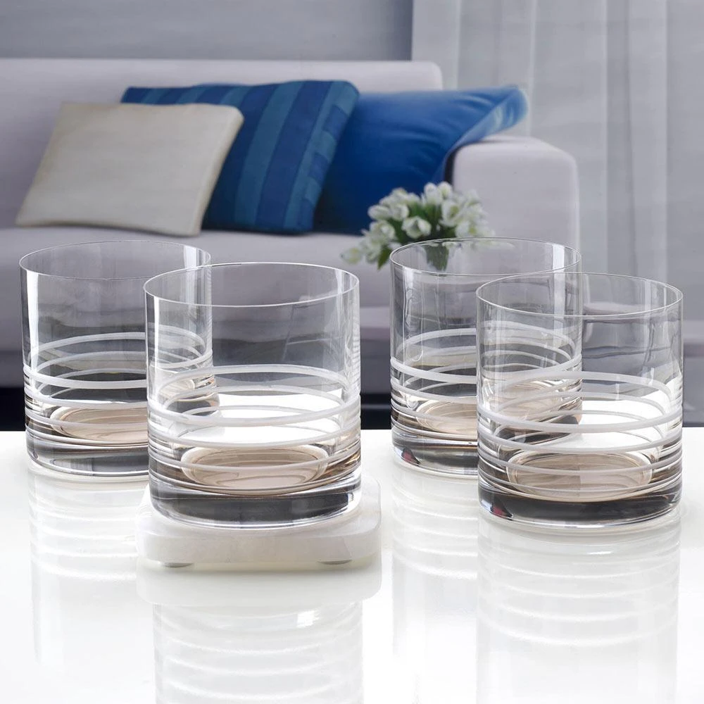 Bring a fresh look and a splash of color to any occasion with this Mikasa Cal Set of 4 Double Old Fashioned Glasses. These stylish and contemporary glasses are highlighted by a smoke tint that begins at the base and fades upward into distinct, horizontal cut lines, creating a visually arresting effect.