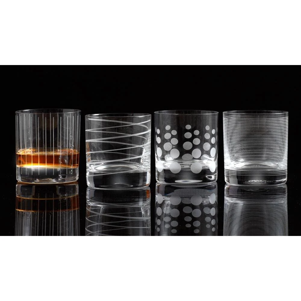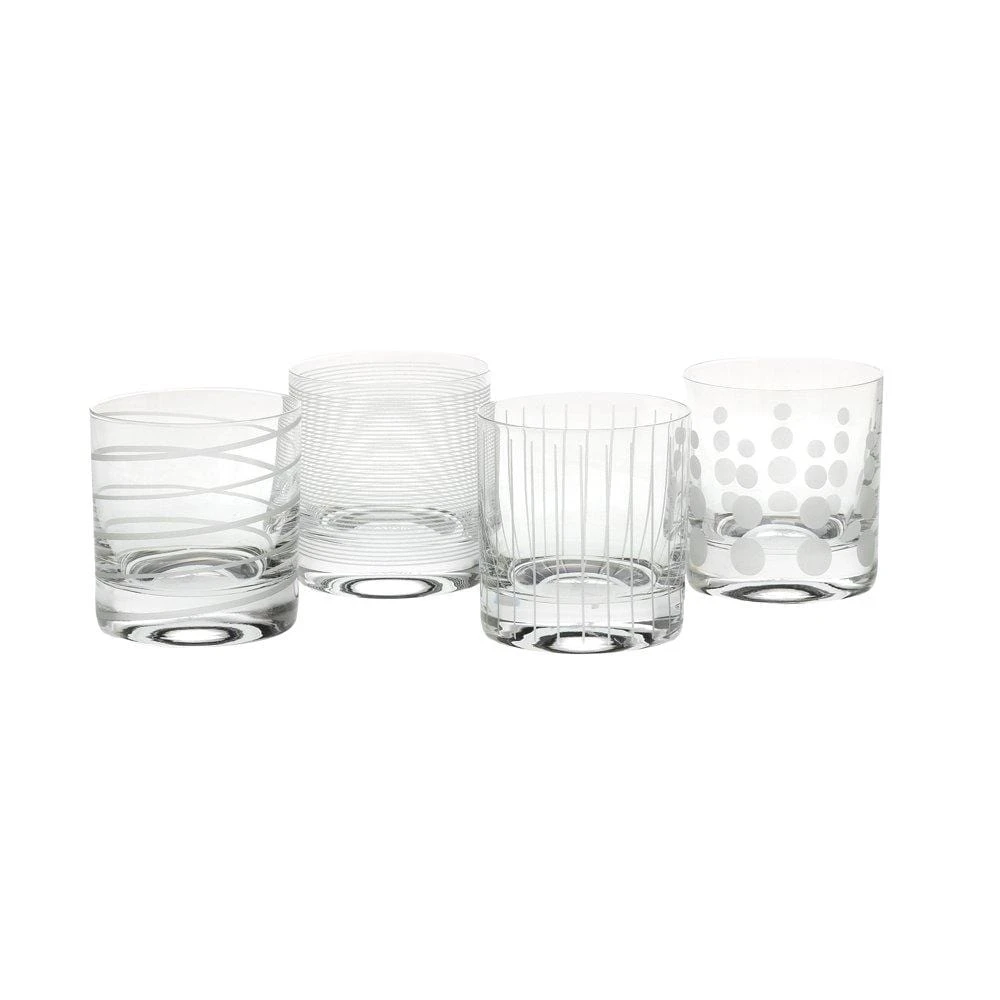 The fun and whimsical designs of the Cheers collection set a festive mood at any gathering. Each glass in the set of 4 is precision-etched with a different yet coordinating design. The dots, lines, and swirls are also distinctive to easily identify your glass. Dishwasher safe. Set of 4 double old fashioned glasses, each holds 12-3/4 ounce.