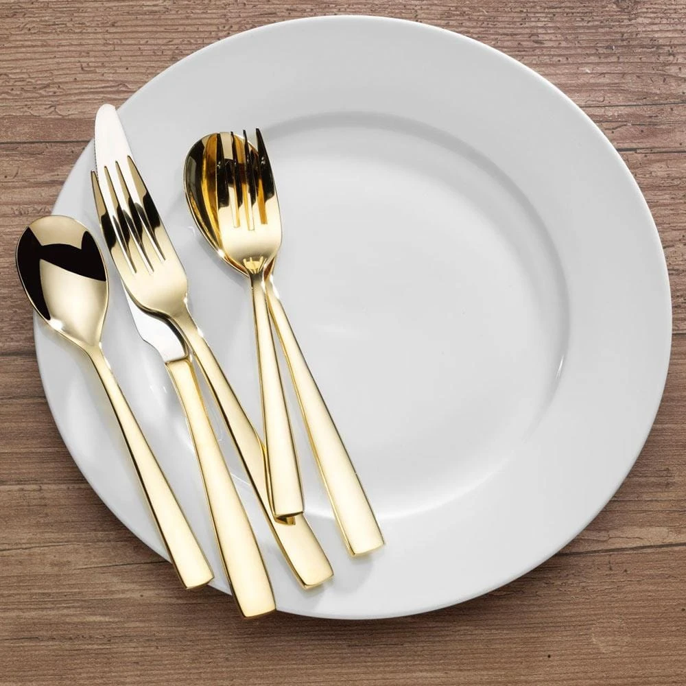 Mikasa Delano Gold Plated Flatware features a transitional design that works well for both casual and formal dining. With the stunning handle design, this flatware set is versatile enough to complement any dinnerware collection. Crafted of superior quality 18/0 stainless steel, this set will stand up to the rigors of everyday use. 20 piece set, service for four, includes (4) each: dinner fork, salad fork, dinner knife, dinner spoon and teaspoon. Hand wash.