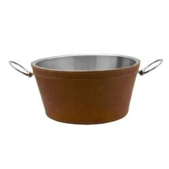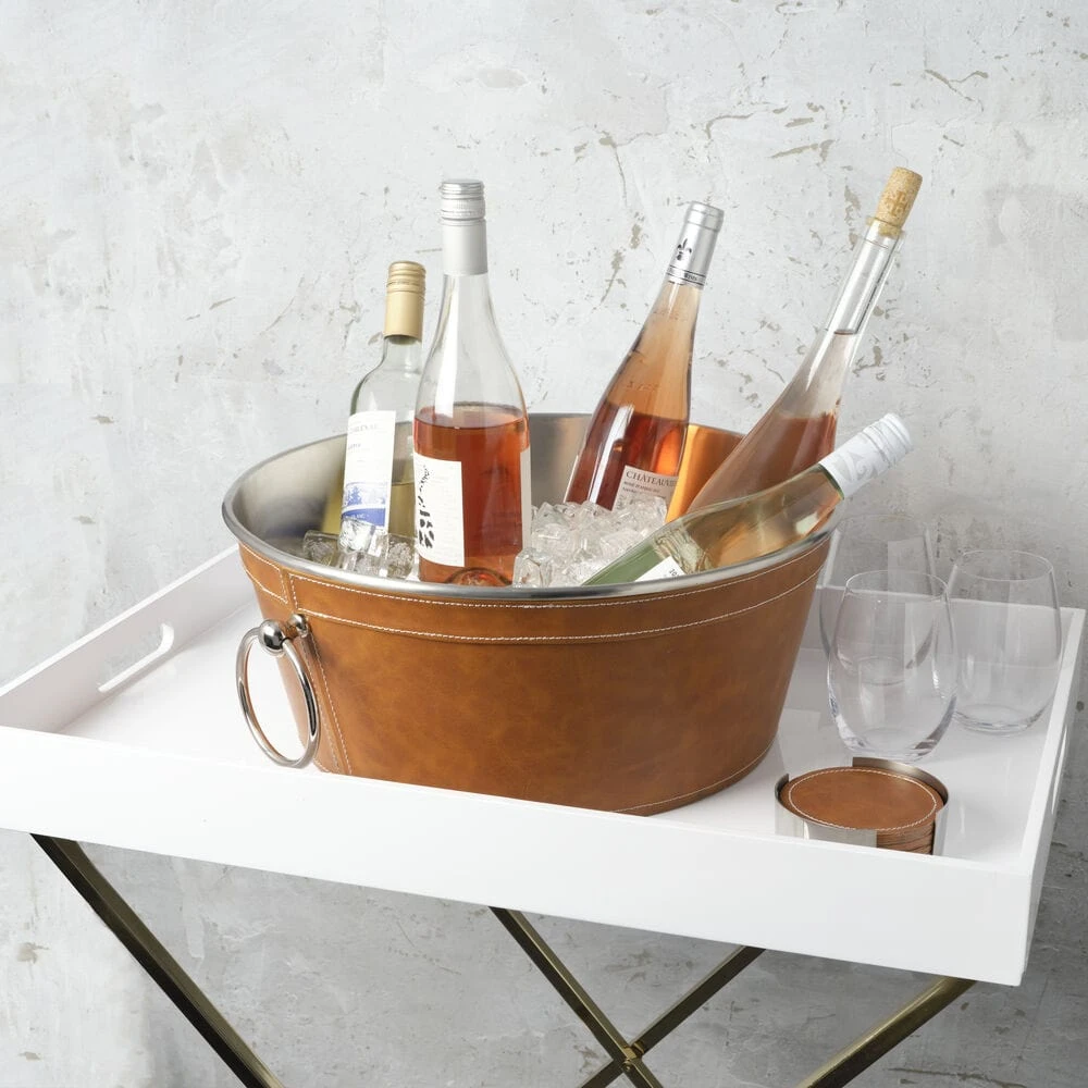 This Faux Leather Stitched Beverage Tub is both traditional and modern but also timeless and sophisticated. It takes your home bar to new heights. This handsome large beverage tub is double walled to ensure your ice stays cold and the outside surface stays condensation free and has handles for carrying ease.