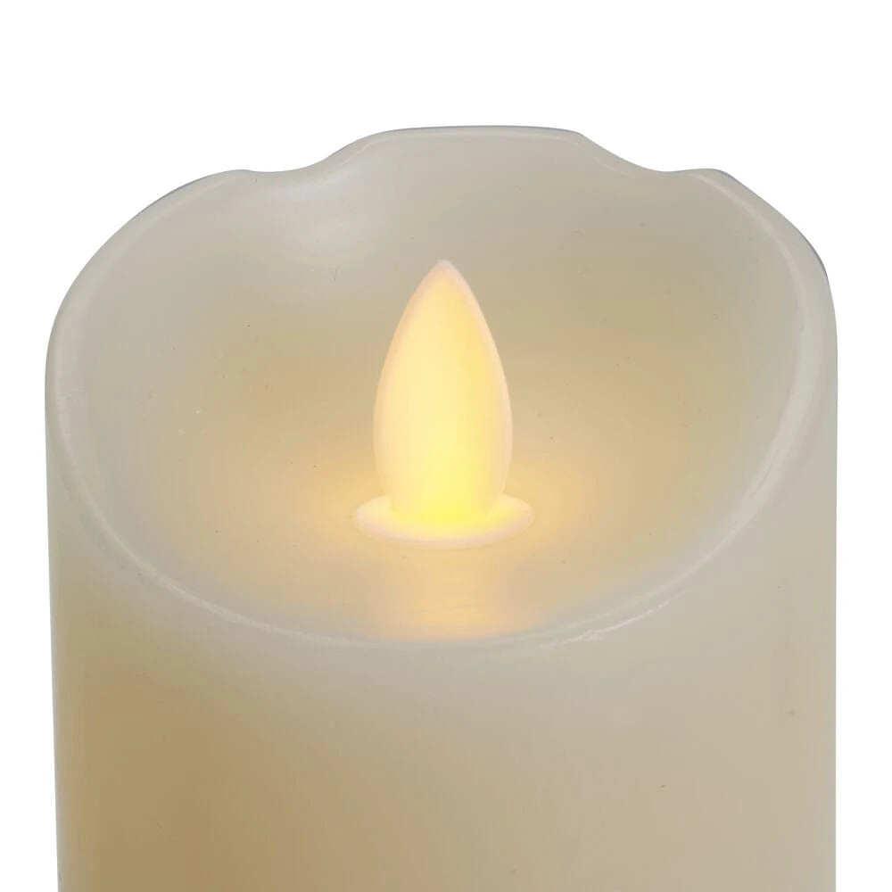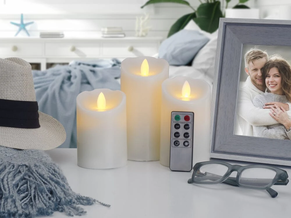 • Flameless Set of 3 Melted Edge Pillar LED Candles with Remote includes 3 candles with 2, 4, 6, or 8 hour timer selection, an 8-key remote control to conveniently turn candles on and off, and a long-lasting, 750- hour run time