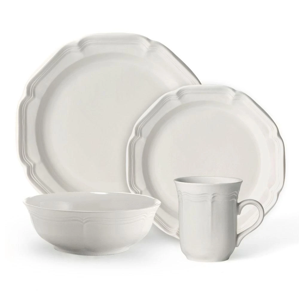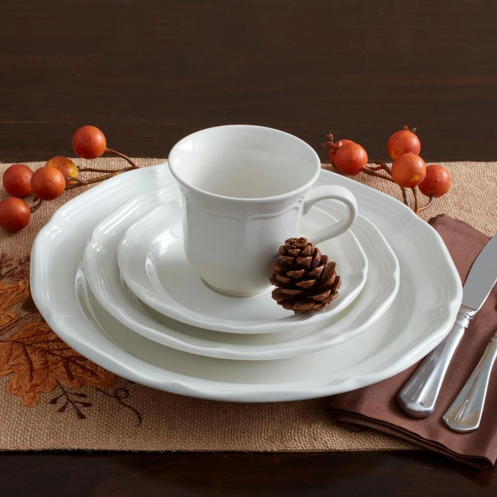 Gently scalloped edges and curves on these generous sized pieces add grace every time you set the table. Its rich cream color makes French Countryside a perfect base pattern to mix with colorful accent pieces. A best selling pattern, a complete suite of accessories is available to create a classically stylish casual dining statement. Expertly crafted from stoneware. Microwave and dishwasher safe. 4 piece place setting includes a 10-3/4 inch dinner plate, 8-1/4 inch salad plate, 7 inch diameter (28 ounce) soup cereal bowl and 11 ounce mug.