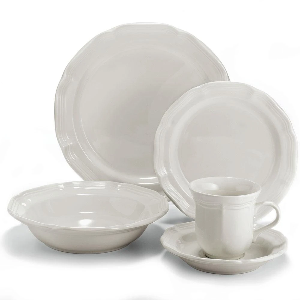 Gently scalloped edges and curves on these generous sized pieces add grace every time you set the table. Its rich cream color makes French Countryside a perfect base pattern to mix with colorful accent pieces. A best selling pattern, a complete suite of accessories is available to create a classically stylish casual dining statement. Expertly crafted from stoneware. Microwave and dishwasher safe. This 5 piece place setting includes an 10-3/4 inch dinner plate, 8-1/4 inch salad plate, 8-1/4 inch (15 ounce) rim soup bowl, 8-1/2 ounce tea cup and 6-1/4 inch tea saucer.