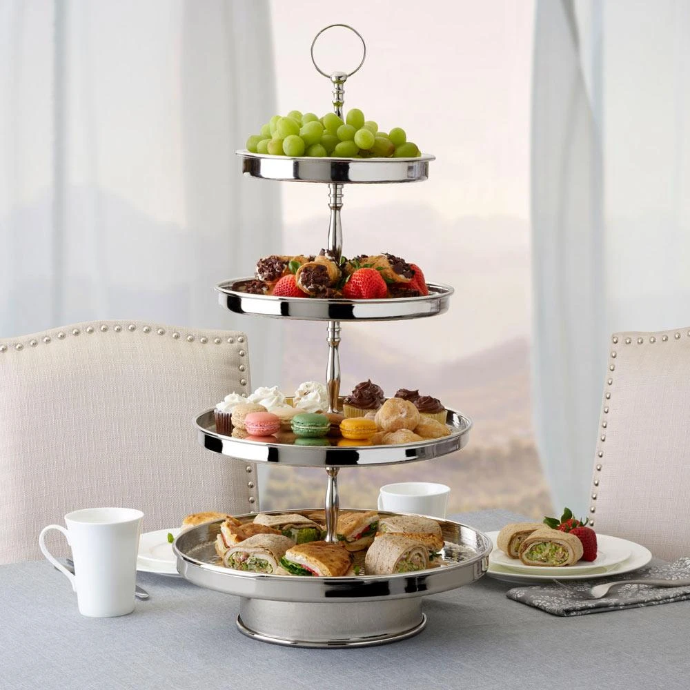 This Mikasa Hammered 4 Tiered Server will make everything you serve a dramatic focal piece on your dining or buffet table. This striking server features 4 levels of serving space, and the height and shape of this piece will provide a dramatic entertaining presentation. Crafted of durable, food safe, cast-aluminum, with an attractive hammered design. Hand wash. 4 tiered server measure 24-1/2 inch high x 14-3/4 inch diameter; the base measures 8-1/2 inch diameter.
