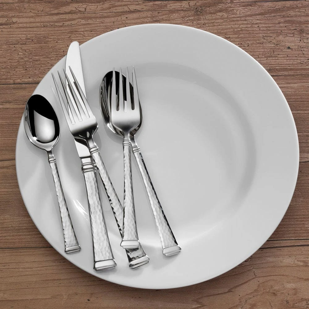 This Harmony Hammered Flatware Set features simple banding at the neck and base of the handle, with a unique hammered design that accentuates a timeless silhouette. A classic design that can be used for all occasions, whether a formal affair, or a casual dinner with friends and family.