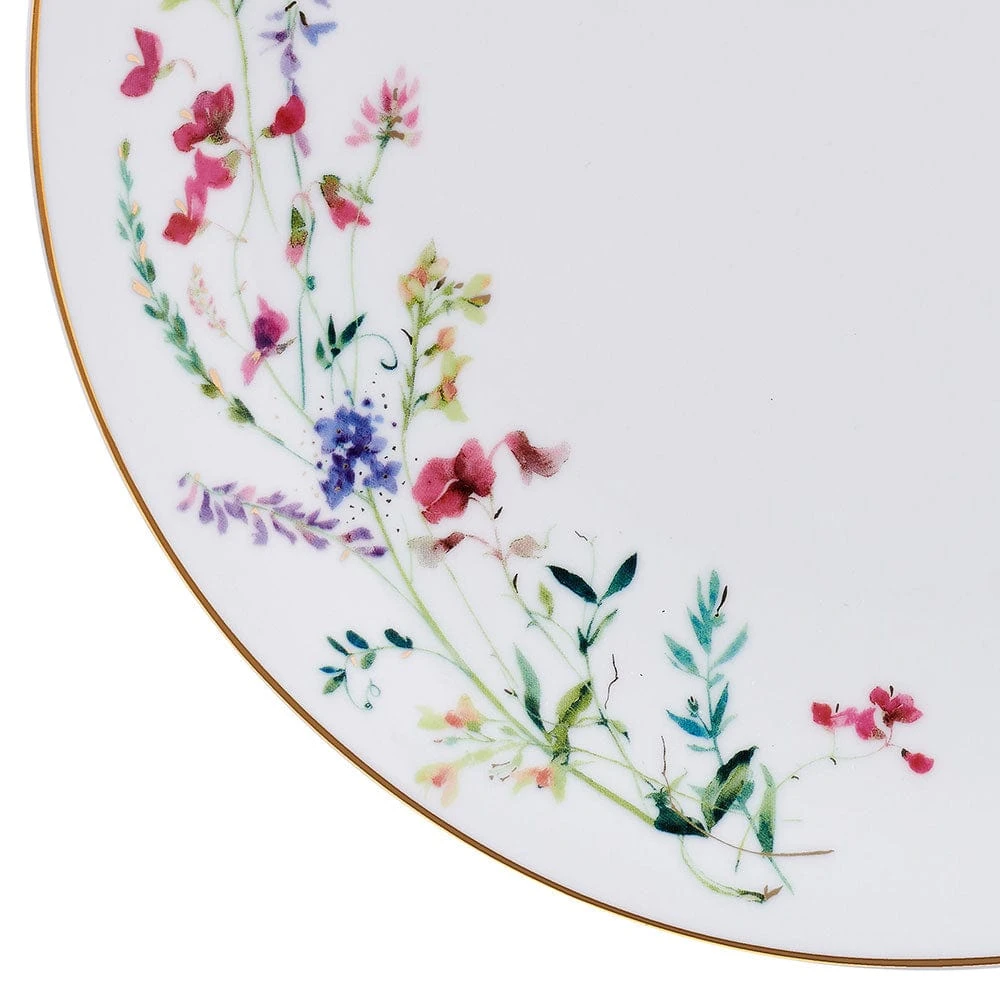 This Kalina Gold Dinnerware Set features a crisp white background adorned with a wisp of floral buds that dance delicately up one side, highlighted with metallic gold accents and a metallic gold rim that will add a touch of sophistication to your table.