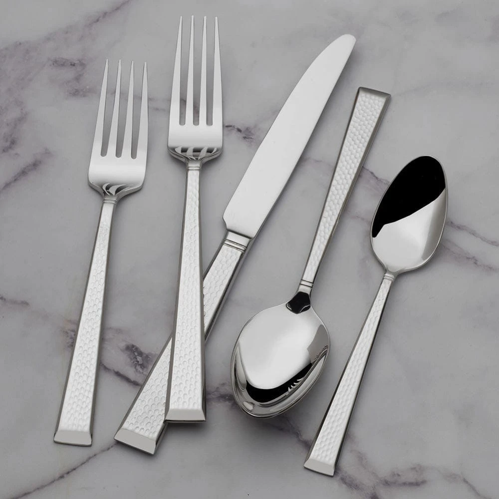 Mikasa Kyler Flatware brings contemporary elegance to the table. Each piece is crafted from premium 18/10 stainless steel to deliver outstanding beauty and performance. A modern hammered texture gives the sleek handles a faceted shimmer that will make a bold statement at every dining occasion. Flatware wears a lustrous mirror finish yet goes safely through the dishwasher without needing polishing. 65 piece set, service for twelve, includes (12) each: dinner fork, salad fork, dinner knife, dinner spoon, and teaspoon, plus (1) each: tablespoon, pierced tablespoon, cold meat fork, sugar spoon and butter knife. Dishwasher safe.