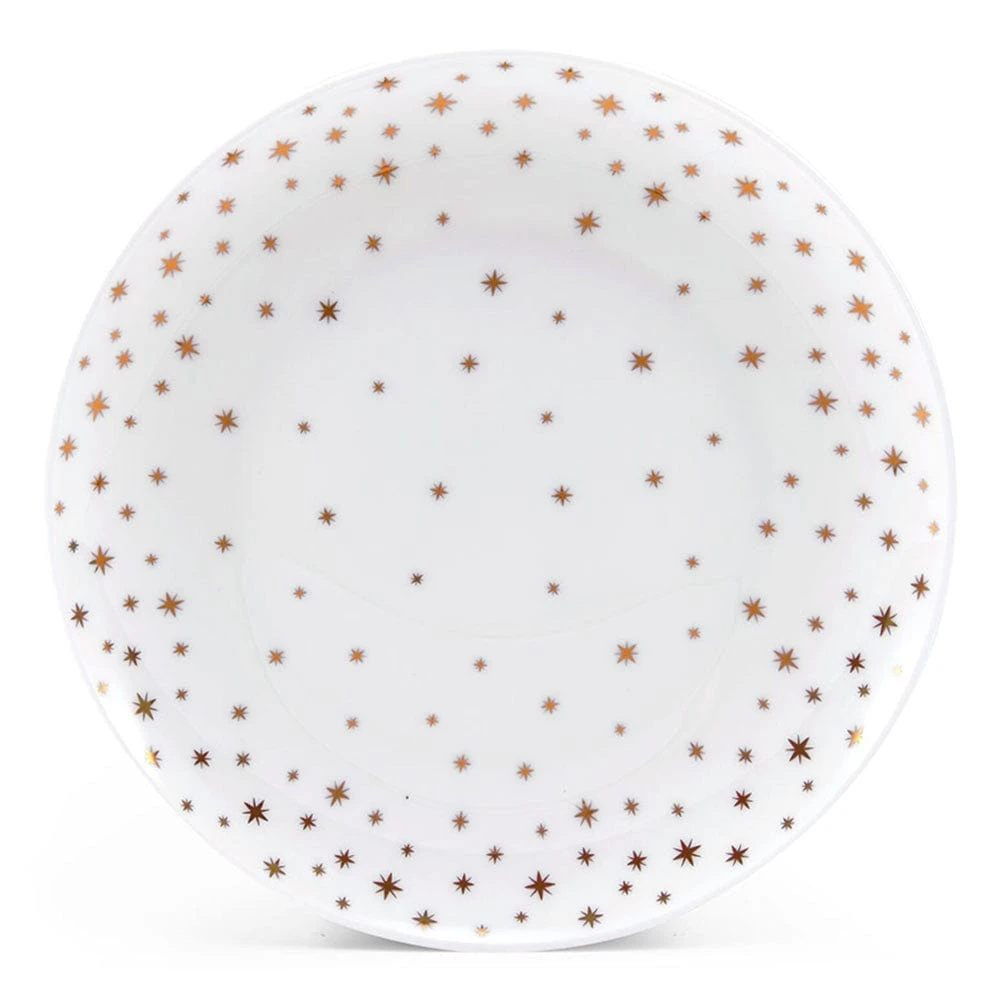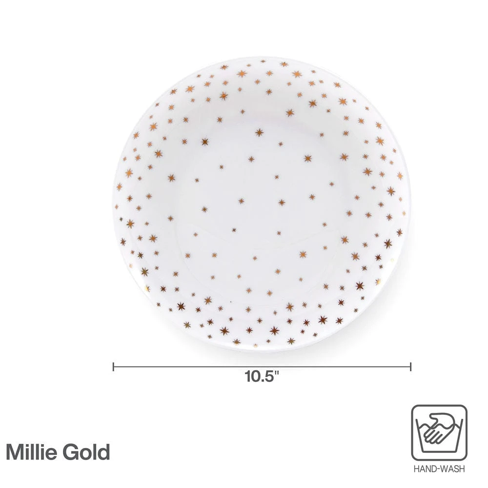 This Mikasa Millie Gold Set of 4 Dinner Plates feature a contemporary coupe shape that is sprinkled with a dazzling star pattern, and is perfect for everyday dining, but also great for bringing excitement to upbeat celebration dinners.