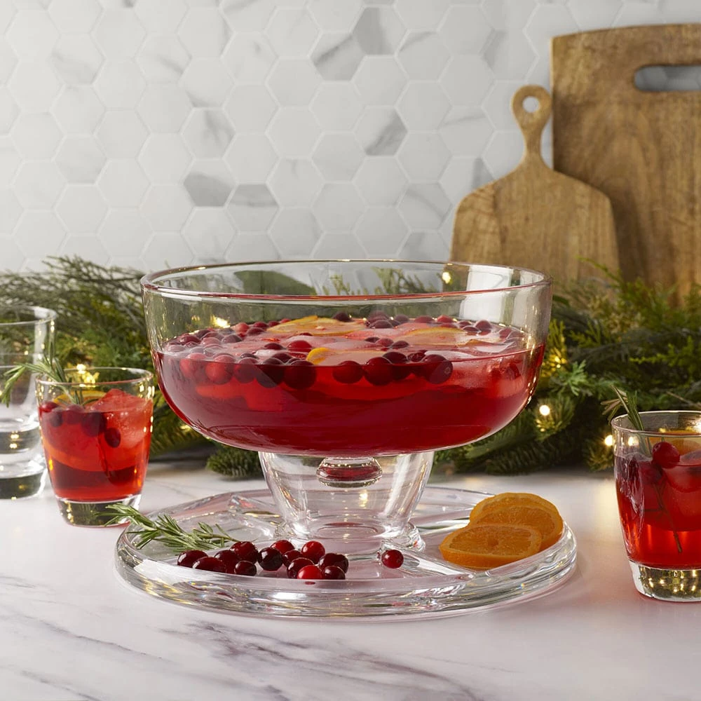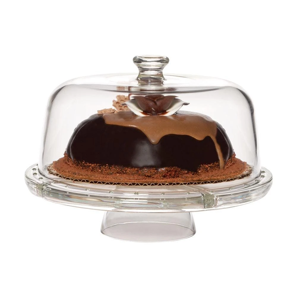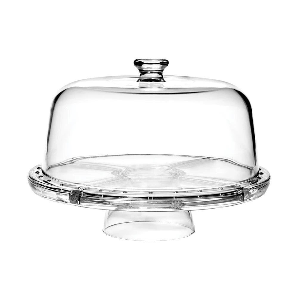 This Napoli Glass 4-in-1 footed cake plate with dome can be used as a Covered Cake Dome, a Chip and Dip, a Punch Bowl or Footed Platter. Crafted of glass. Dishwasher safe. Glass 4-in-1 server measures 12-1/4 inch diameter x 9 inches high.
