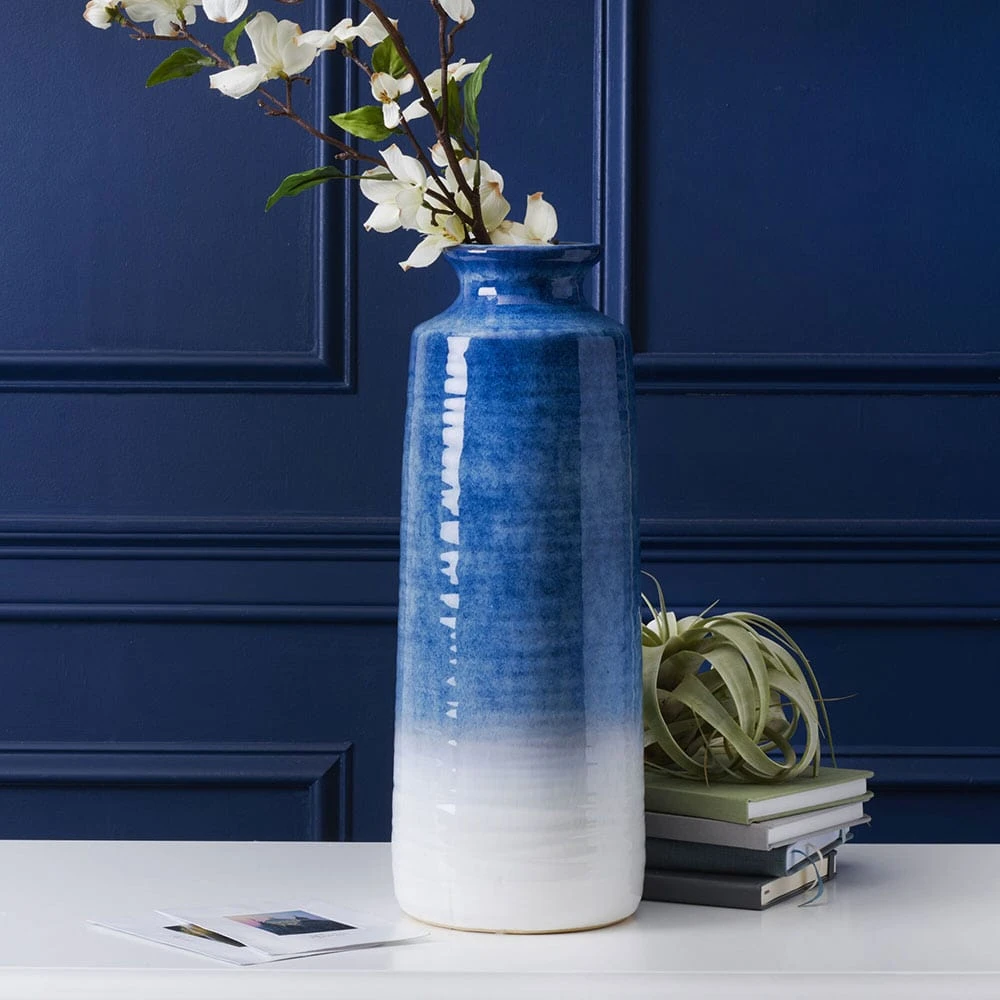Showcase unique arrangements of faux flowers and plants, feathers, and more in this Ceramic Blue and White Vase by Mikasa. This eye-catching vase features a blue and white ombre finish that adds a bold look to your decor. This contemporary vase is the perfect accent piece for any tabletop piece of furniture, and makes a great gift for housewarming parties, weddings, and more. Measures 6 inch L x 6 inch W x 15.75 inch H.