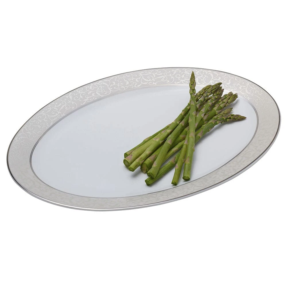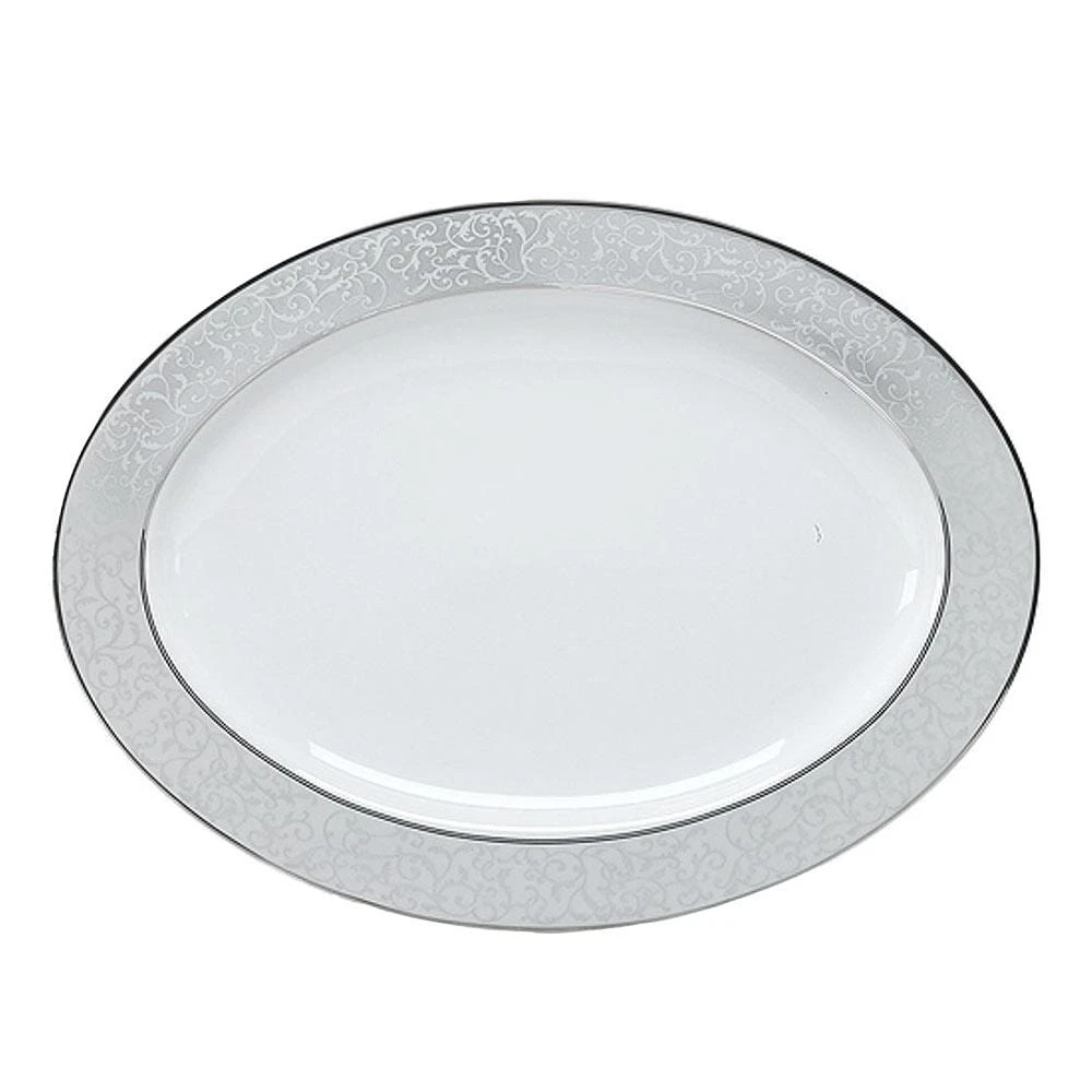 Parchment dinnerware collection features a gentle gray border embellished with a beautifully detailed scroll design. This chic and elegant collection is accented by inner and outer borders of platinum. Crafted of porcelain. Dishwasher safe but not microwave safe. Oval platter measures 14 inch long.