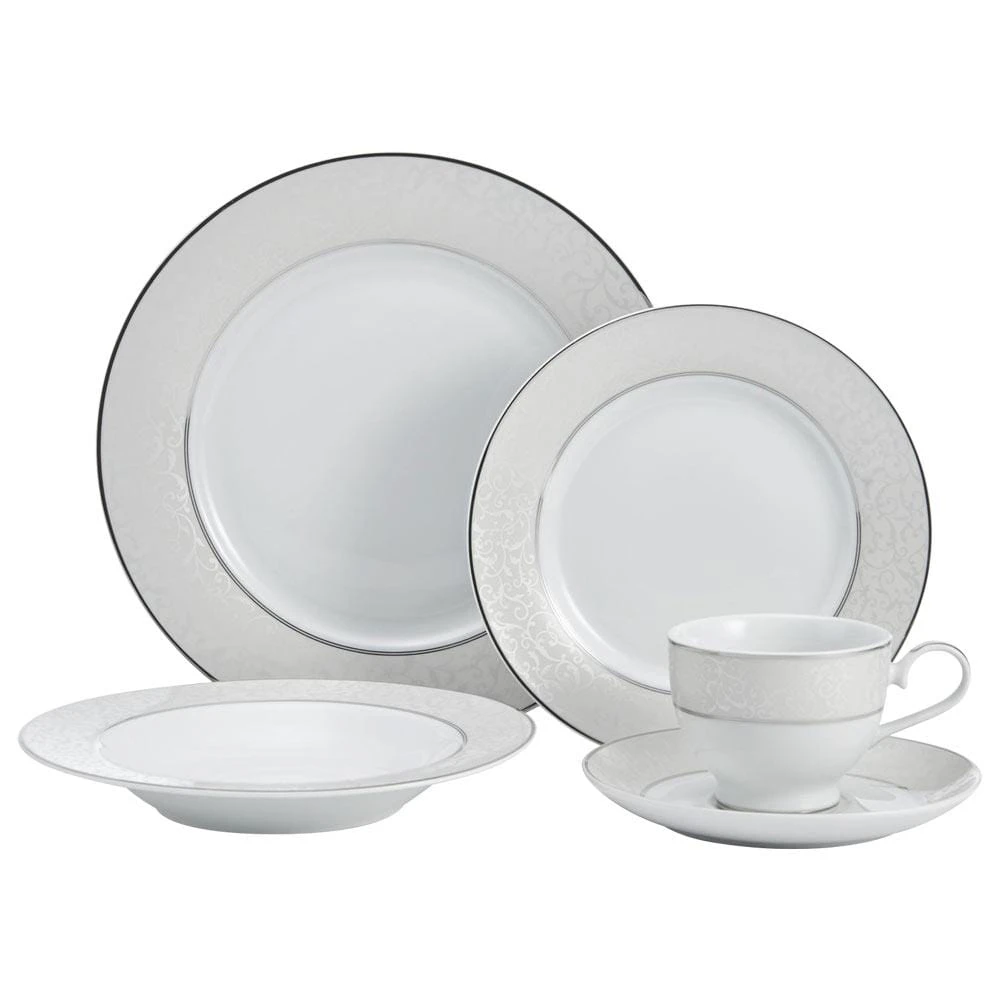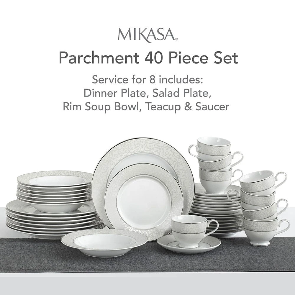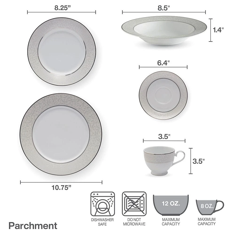 Parchment dinnerware collection features a gentle gray border embellished with a beautifully detailed scroll design. This chic and elegant collection is accented by inner and outer borders of platinum. Crafted of porcelain with metallic accent banding. Dishwasher safe. Not Microwave safe. This 40 piece set includes (8) each: 10-3/4 inch dinner plate, 8-1/4 inch salad plate, 8-1/2 inch rim soup bowl (12 ounce), 8 ounce tea cup and 6-1/2 inch tea saucer.