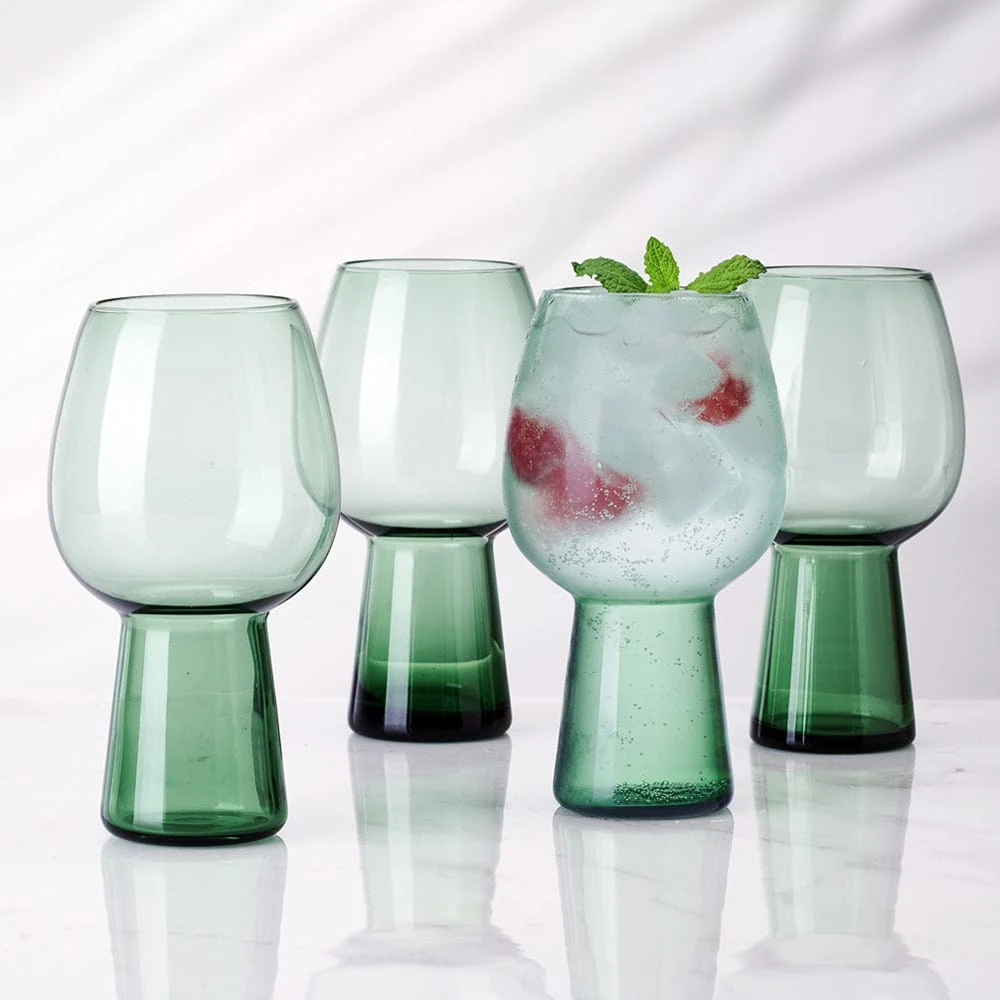 This Phoebe Sage Beer Goblet Glass Set features a modern sage tint, with a wide, open base that provides added capacity, and perfect for serving a variety of cocktails or cold beverages. For convenience, glasses stack for compact storage.