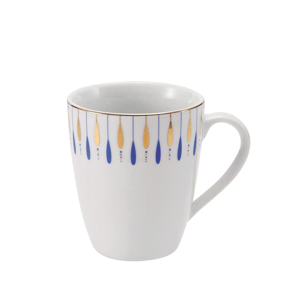 This Starburst Blue Dinnerware Set features a white body with a blue and metallic gold teardrop design that seems to radiate off the edge of each piece, adding modern allure to your tabletop display.
