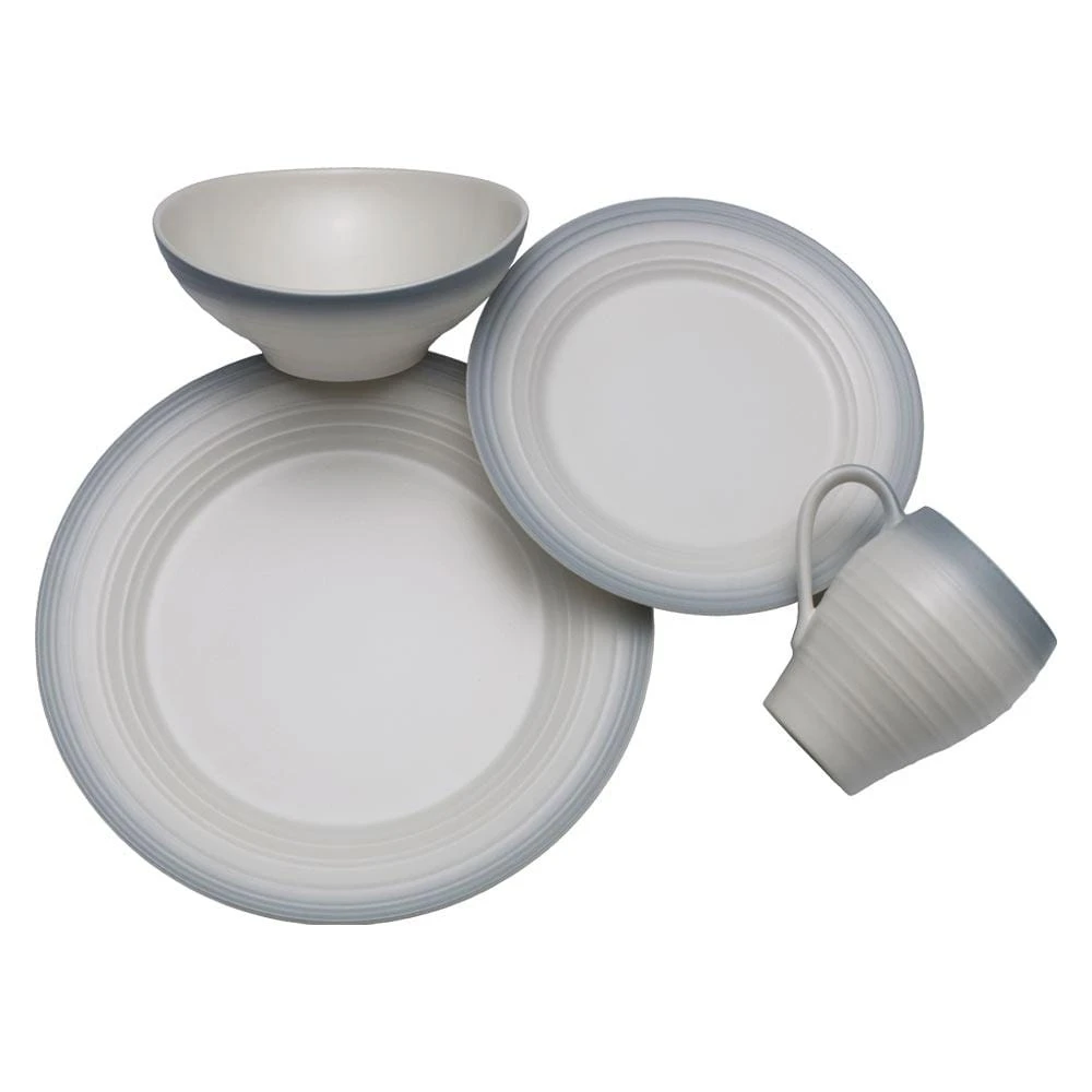 Swirl Ombre features clean lines in a rustic, earthy pattern with a matte and glossy finish, and beautifully graduated coloration, set a striking table setting. The soft rib on the outside of the collection offers a hand made look. Crafted of ironstone with a pin-firing technique which allows the entire bottom of the plate to be glazed, including the base. This process significantly reduces water absorption and increases chip resistance. 4 piece place setting includes an 11-1/4 inch dinner plate, 8-1/2 inch salad plate, 6-3/4 inch (24 ounce) cereal bowl and 18 ounce mug. Microwave and dishwasher safe.
