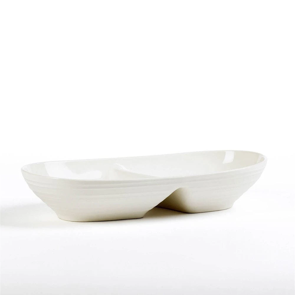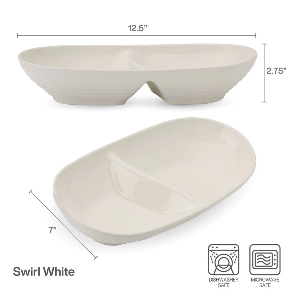 This Swirl White Divided Serving Dish features a rich, double finish – smooth and glossy on the inside, ribbed and matte on the outside, with a pin-firing technique, which allows the entire bottom of the plate to be glazed, including the base. This process significantly reduces water absorption and increases chip resistance.