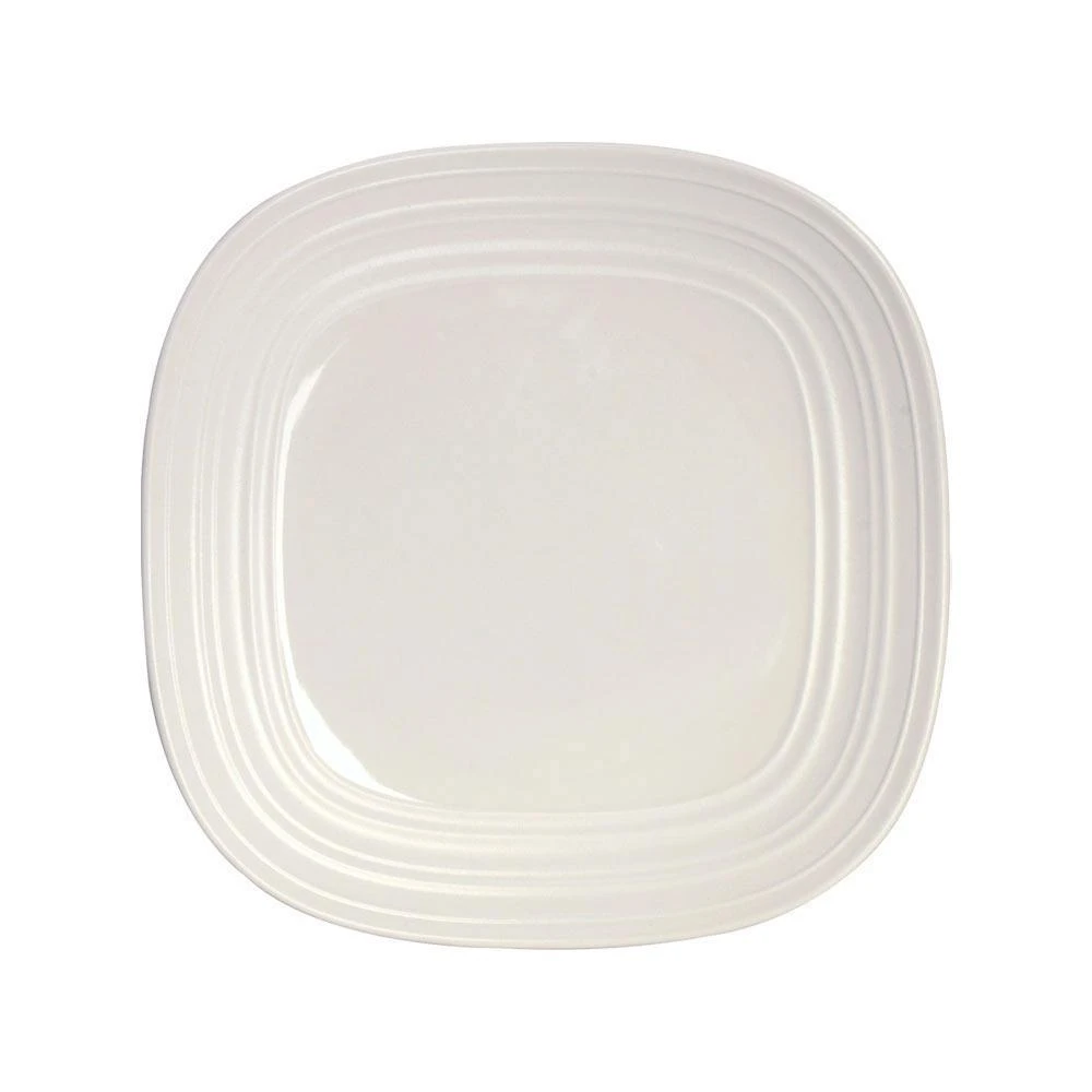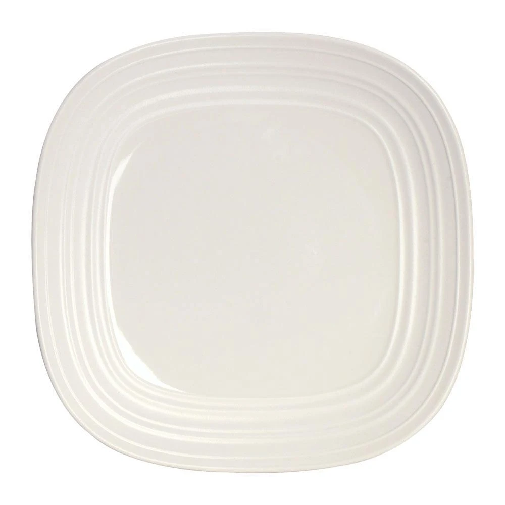 This Mikasa Swirl White Square Dinnerware Set features a rich, double finish – smooth and glossy on the inside, ribbed and matte on the outside, with a pin-firing technique, which allows the entire bottom of the plate to be glazed, including the base. This process significantly reduces water absorption and increases chip resistance.