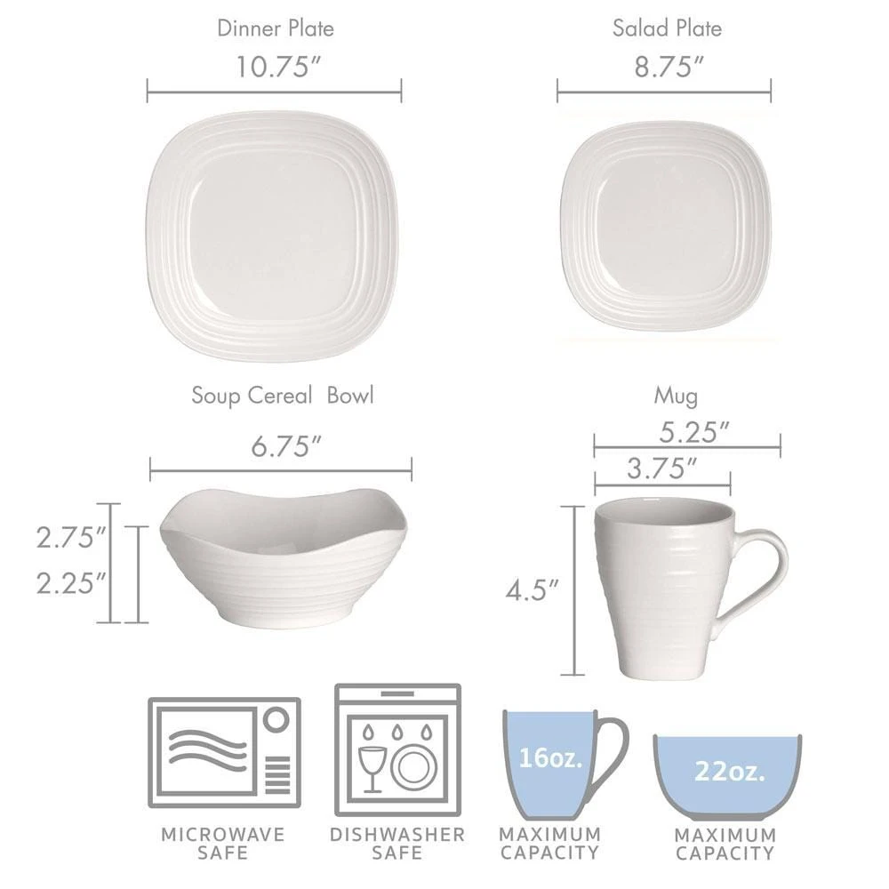 • Dinnerware Set for 4: This 16 piece dinnerware set, includes 4 each of: 10-3/4 inch square dinner plate 8-3/4 inch square salad plate, 22 ounce square soup cereal bowl, and 18 ounce mug