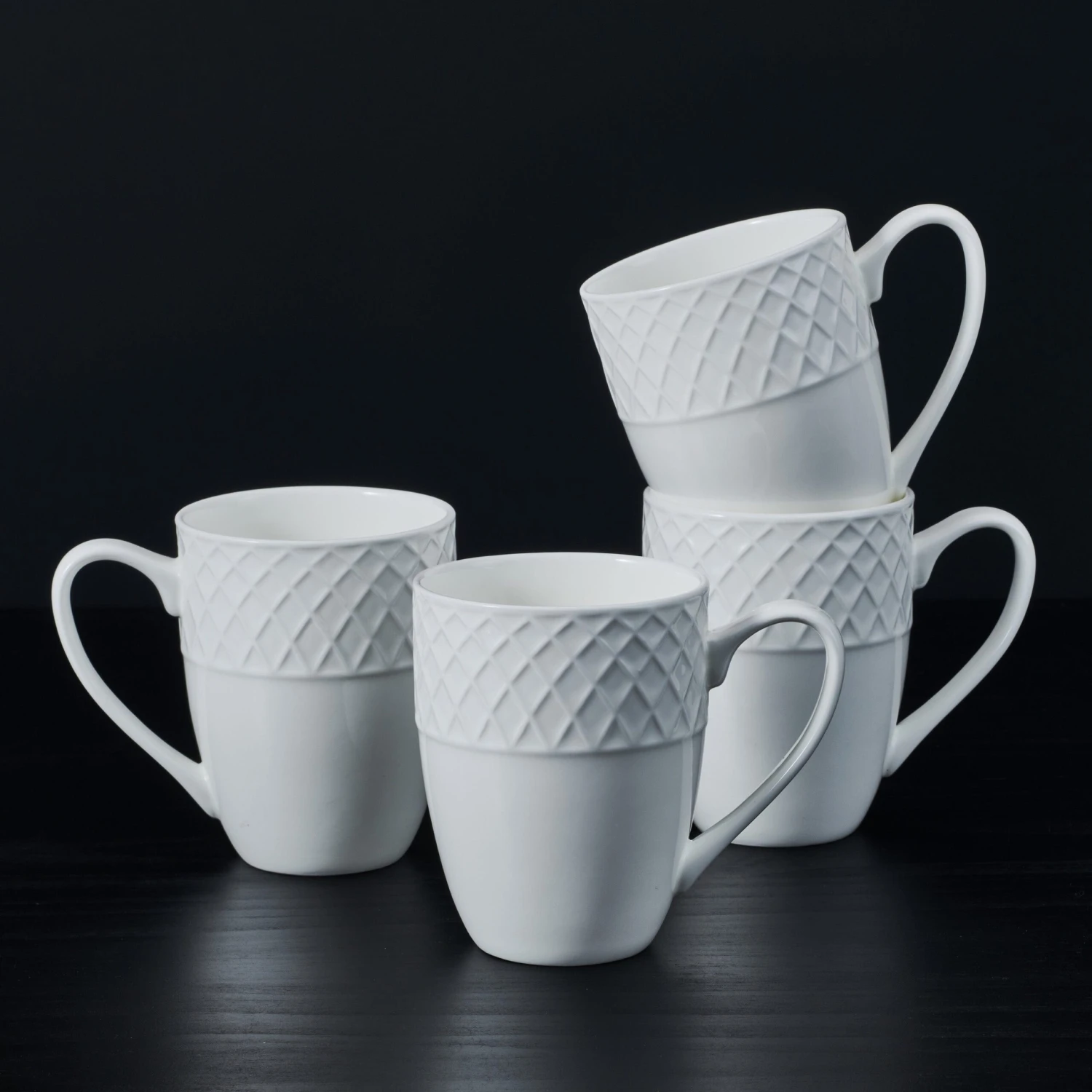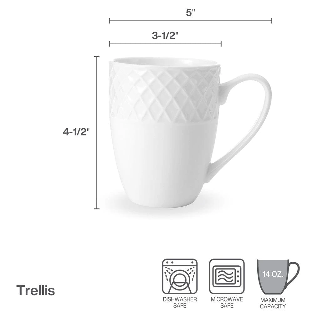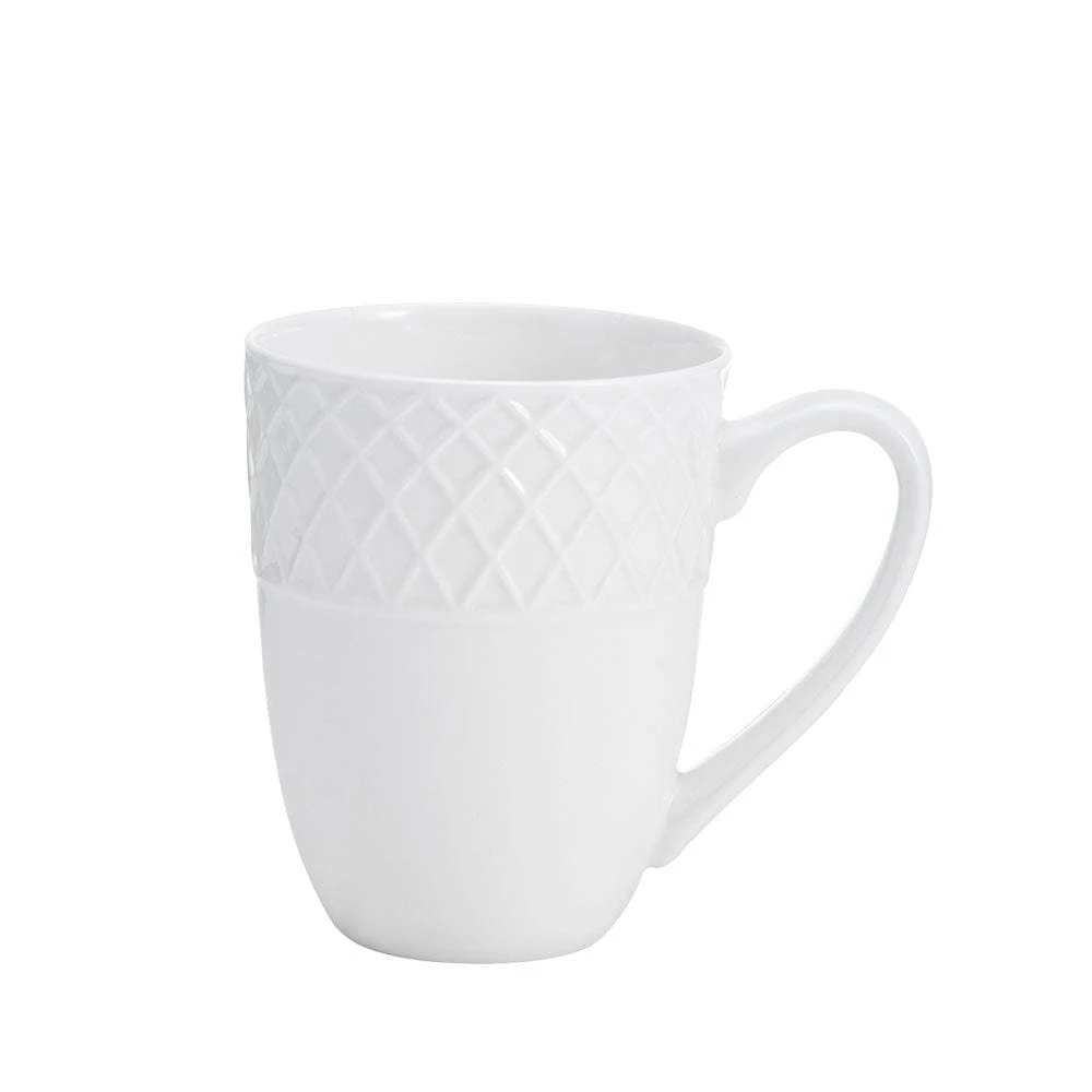 This Trellis White Set of 4 Mugs feature a contemporary, criss-cross line design framing the rim, creating eye-catching depth and movement on your tabletop.