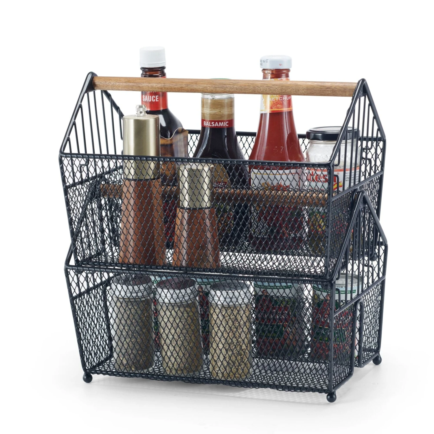 From the Gourmet Basics by Mikasa Collection, this Porto Stacking Storage Basket features a wire frame design, allowing air to circulate through the breathable cage. The stunningly, elegant classic black finish and acacia wood handle will compliment any decor.