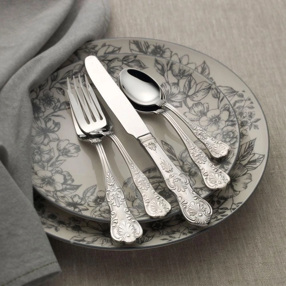 Wallace Queens 65 Piece Flatware Set is constructed of superior quality 18/10 stainless steel, meeting our most demanding standards for strength and durability. This beautiful collection features an intricately detailed design with shells, foliate scrolls and flowers, adding an elegant touch to your table setting. 65 piece set, service for twelve, includes (12) each: dinner fork, salad fork, dinner knife, dinner spoon and teaspoon, PLUS (1) each: tablespoon, pierced tablespoon, cold meat fork, butter knife and sugar spoon. Dishwasher safe.