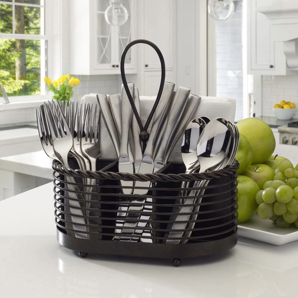 From the Gourmet Basics by Mikasa Collection, this Rope Napkin and Flatware Storage Caddy is a striking way to keep flatware organized and easily accessible to guests. Features an open and airy design, with a handle for easy transporting.