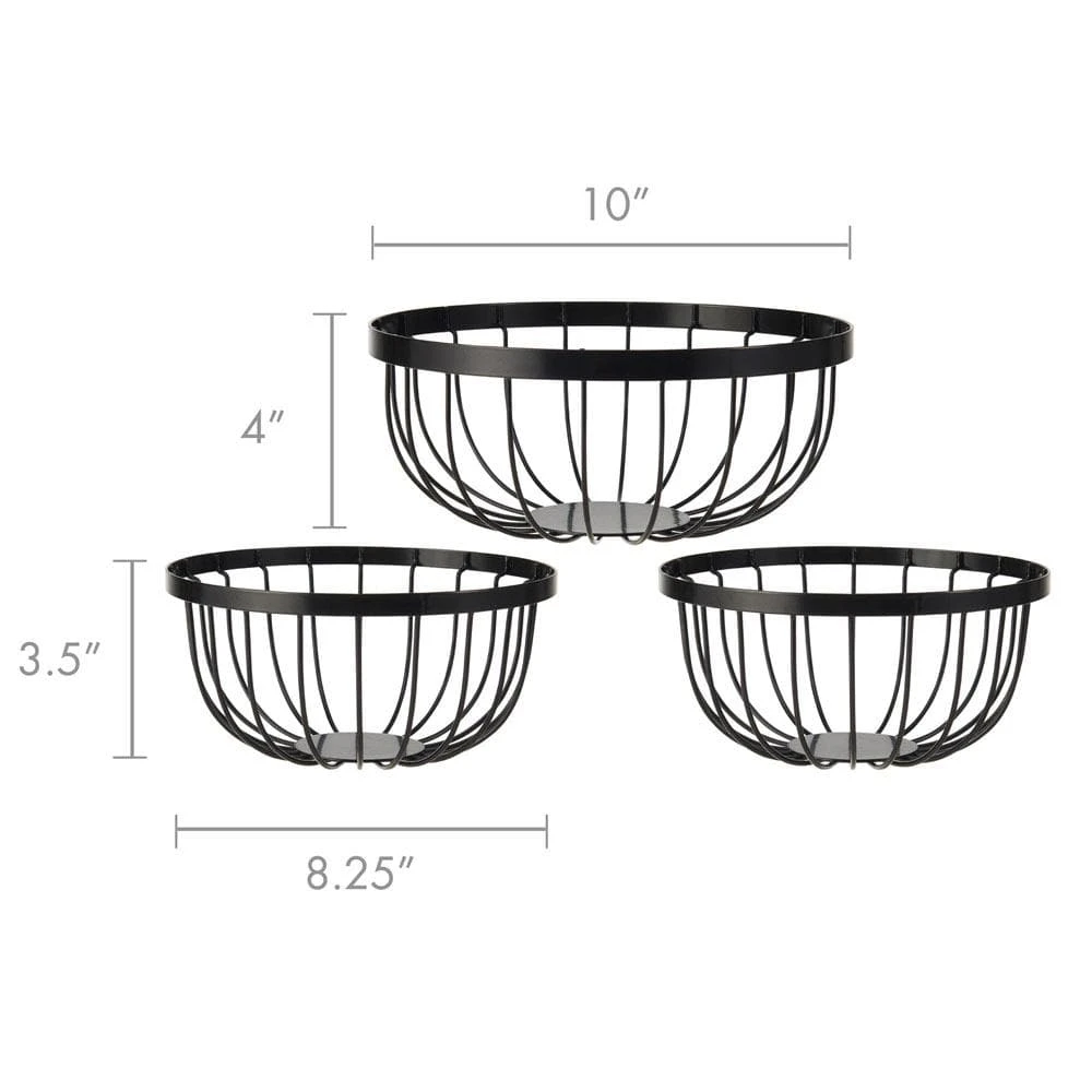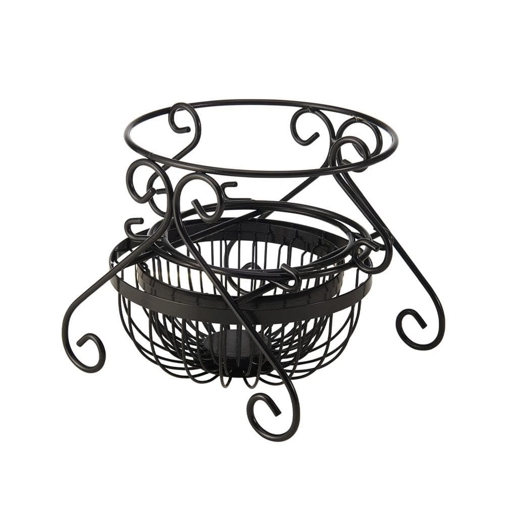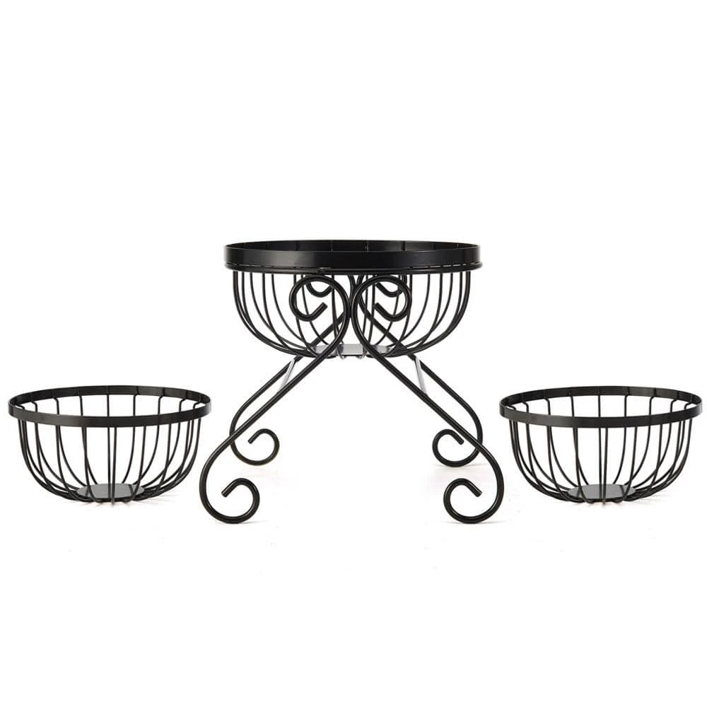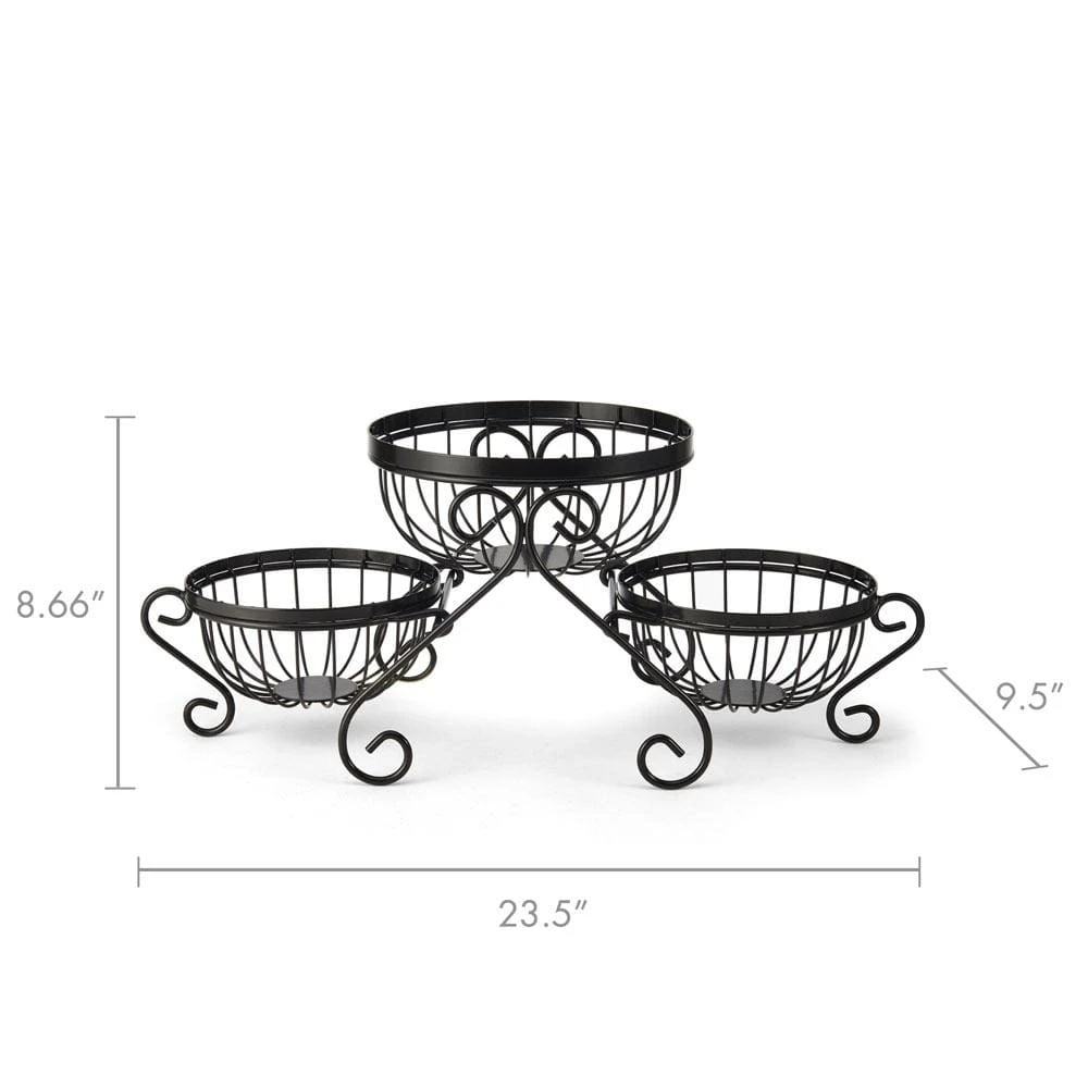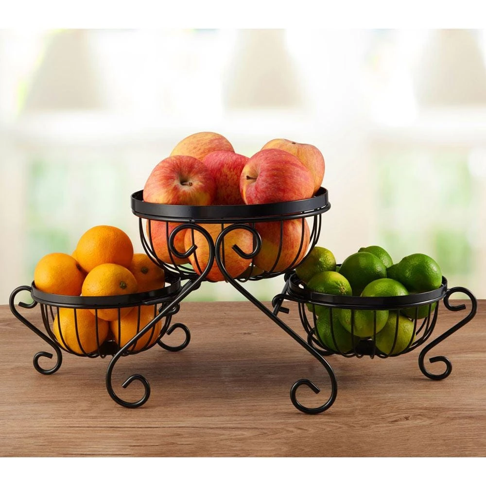 This Gourmet Basics Scroll Set of 3 Fruit Storage Baskets features a wire frame design with a timeless black finish. Baskets are removable from the attractive scroll stand, so they can be configured in a variety of ways or used separately. Plus, they all nest and stack together for compact, convenient storage when not in use.
