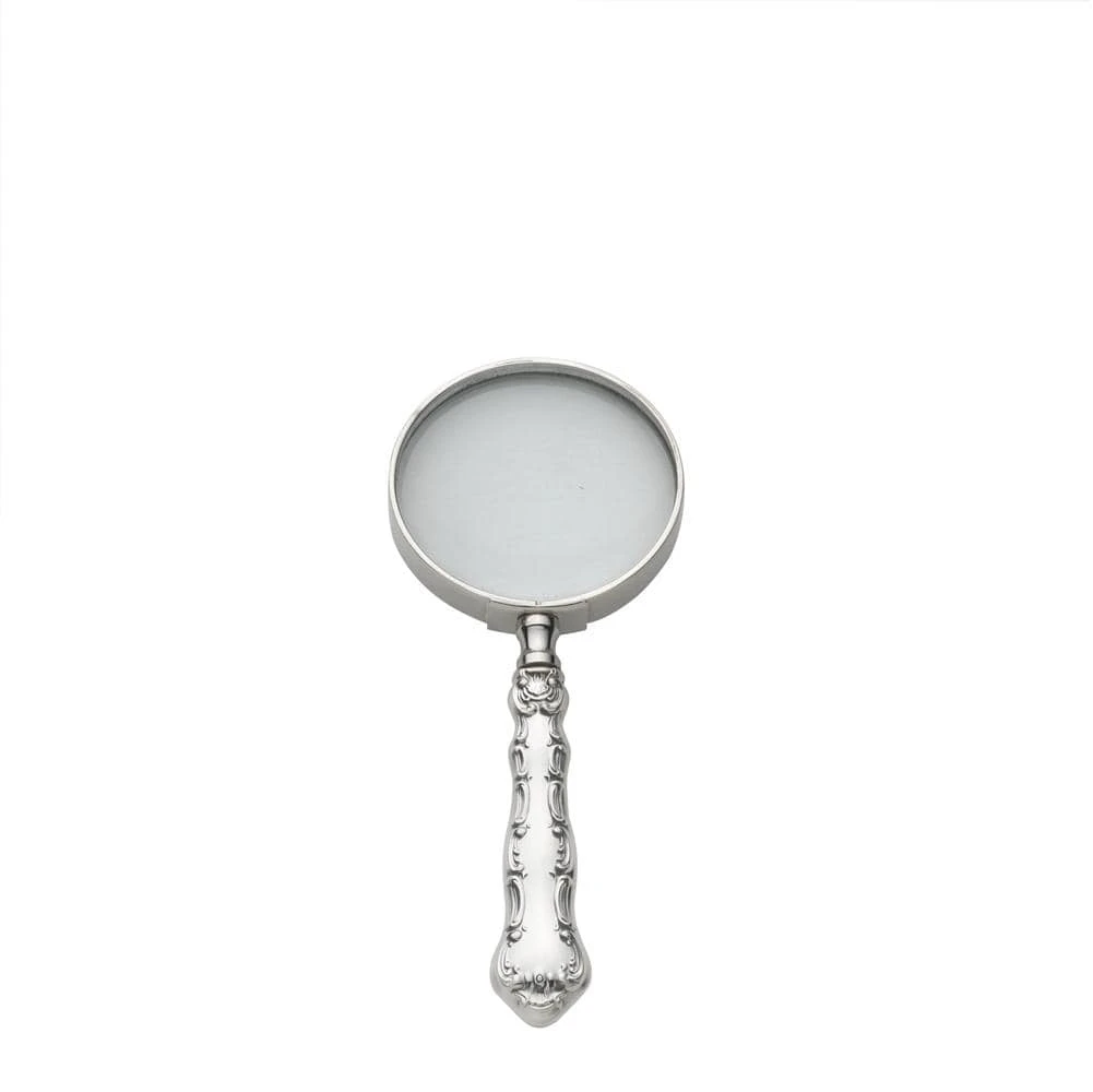 This design, introduced in 1897 of flowing scrollwork follows the gently curved handles of this magnificent pattern inspired by the rococo style of design favoring shell-like curves prevailing in 18th Century France. Named for the French hamlet near the border of Germany, this intricate pattern displays rococo exuberance with hints of lively German Baroque opulence. The finely carved details along the edge highlight a smooth central panel, and culminate in a subtle shell near the tip. Magnifying glass is an essential desk accessory, perfect for enlarging fine print. Magnifying glass is 2 1/2″ dia., 6 3/8″ long. Crafted of Sterling Silver. Made in USA.Â