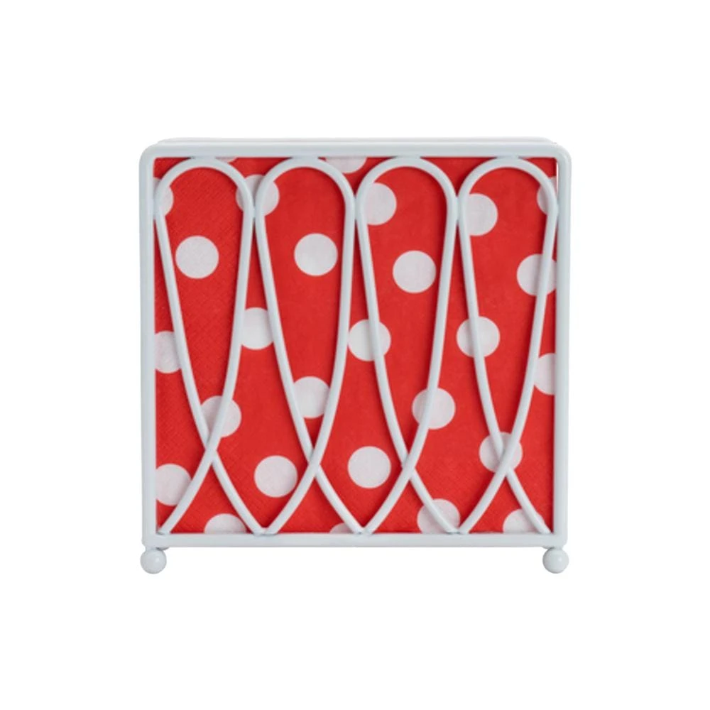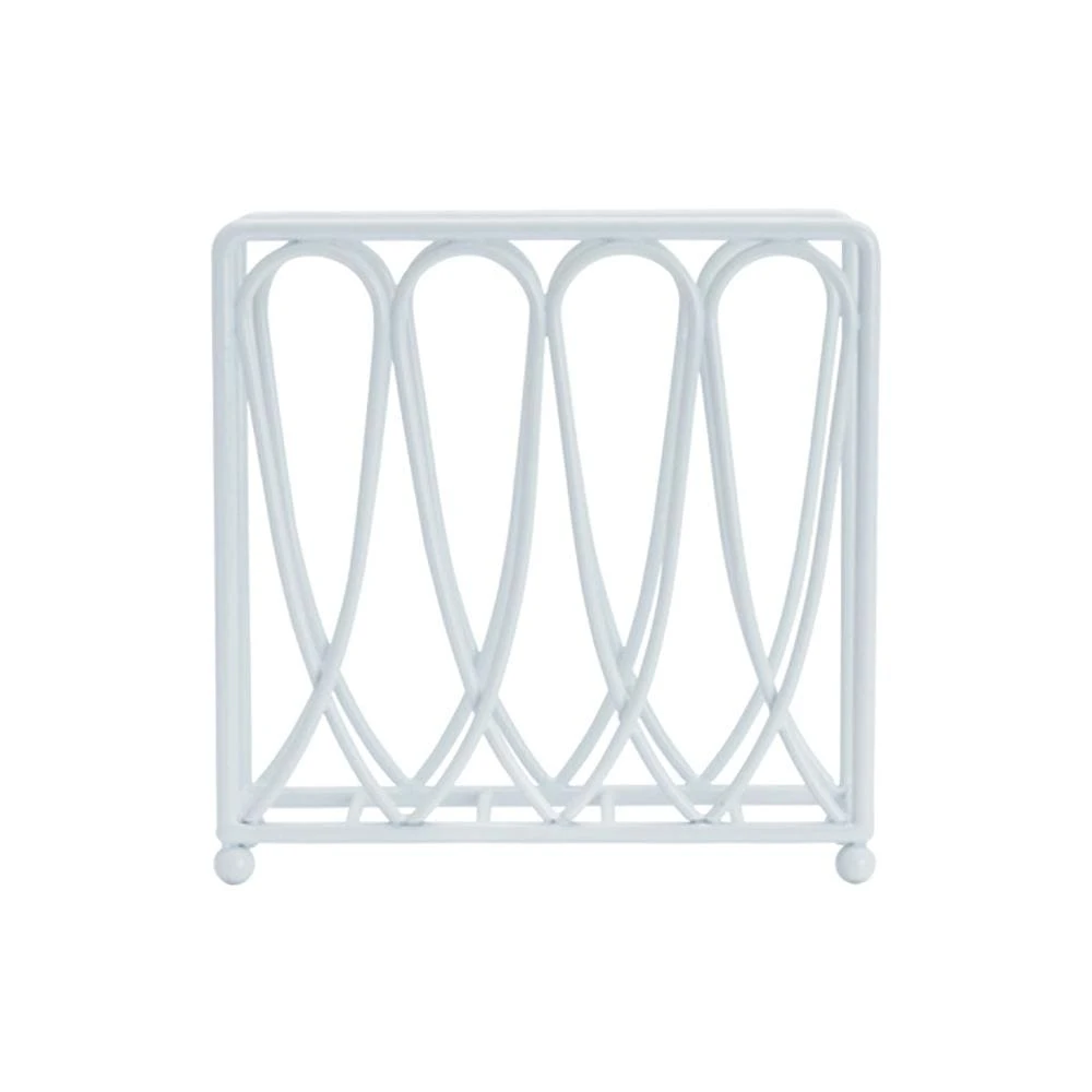 This Victorian Loop White Wire Napkin Holder features a timeless design that will complement any decor. It’s a striking way to keep napkins from going airborne in summer breezes, as well as keeping them organized and easily accessible to guests. Handcrafted from high grade carbon structural steel for long lasting beauty even under rigorous use. Wipe clean with a damp cloth. Napkins not included. Napkin holder measures 7 inch long x 3 inch wide x 7 inch high.